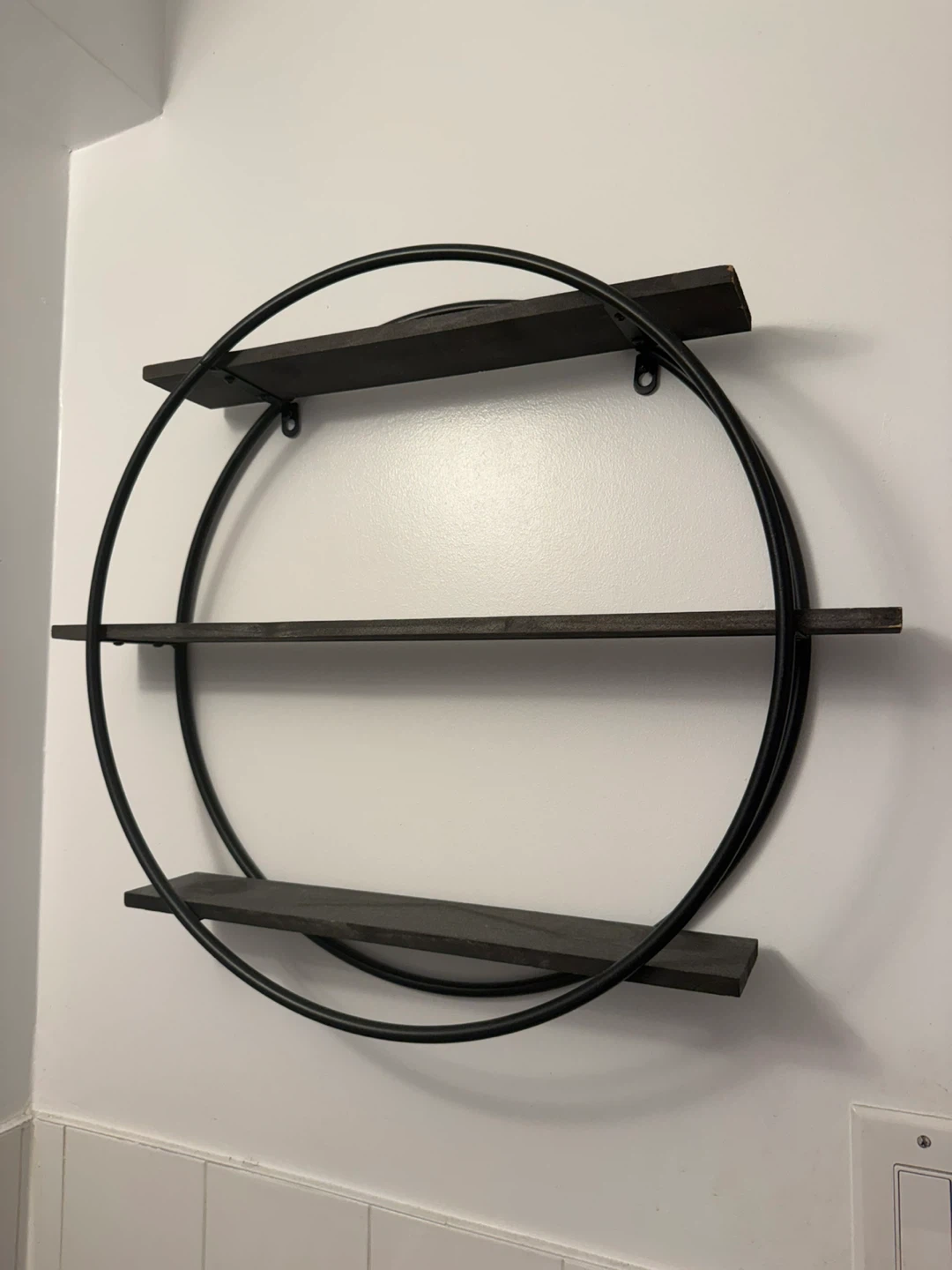 This wall shelf features a black metal circular frame with three dark wood shelves. It's great for displaying small items or plants. Metal and wood construction.