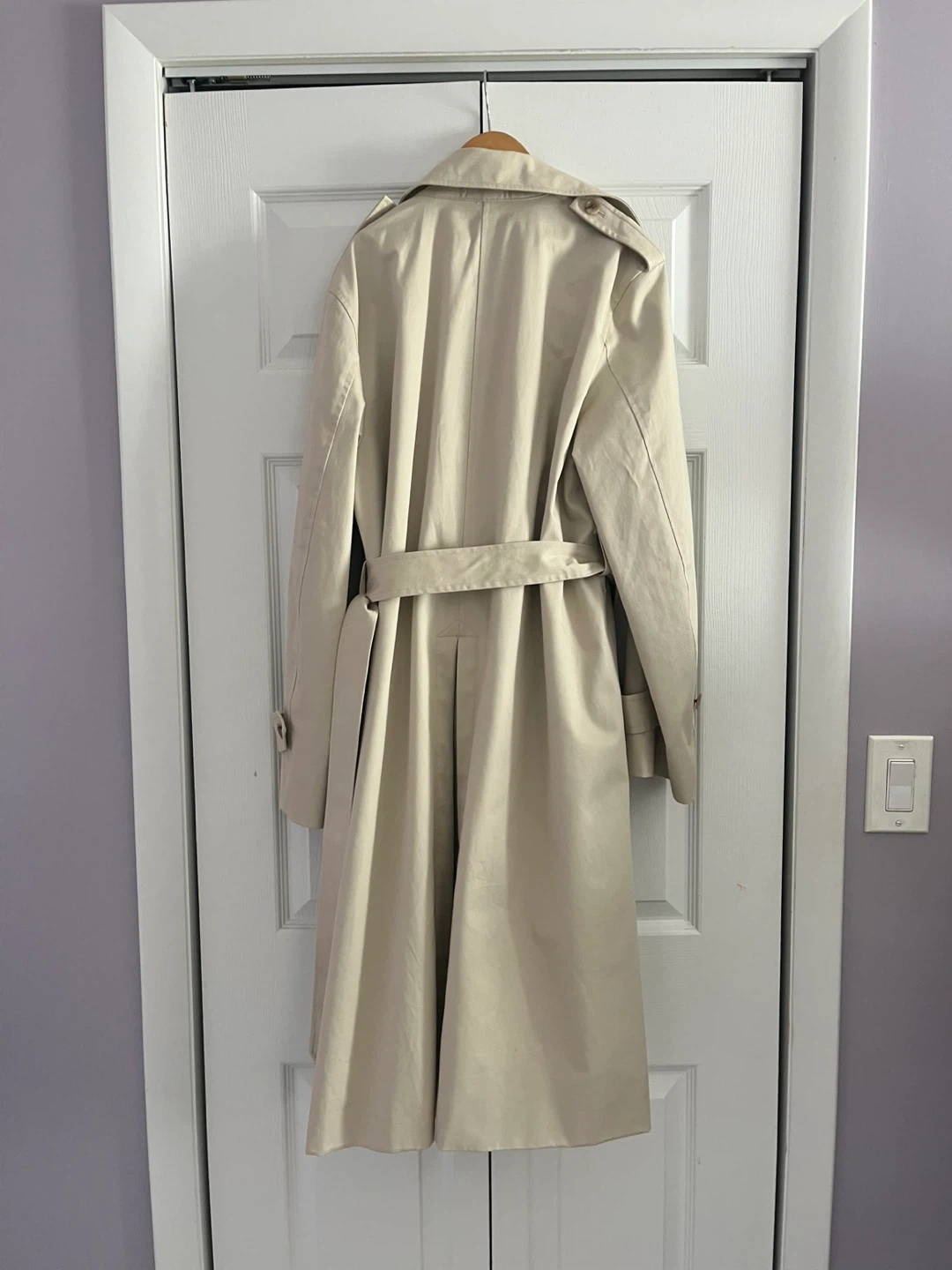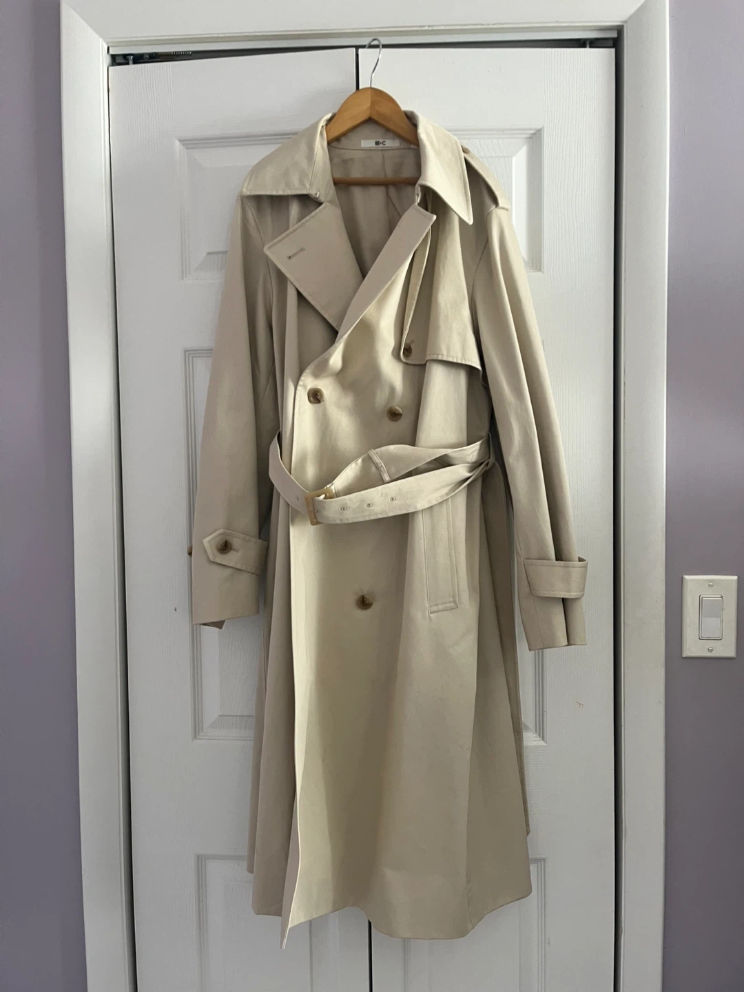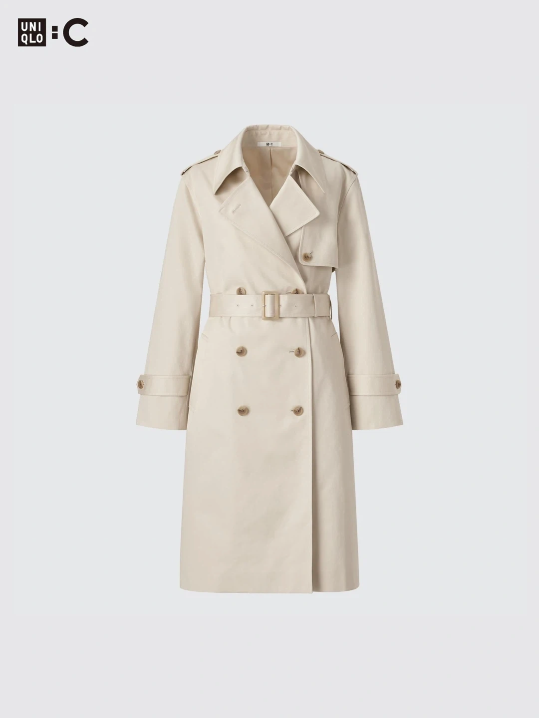 Classic beige trench coat from UNIQLO C. Double-breasted design with a belted waist.