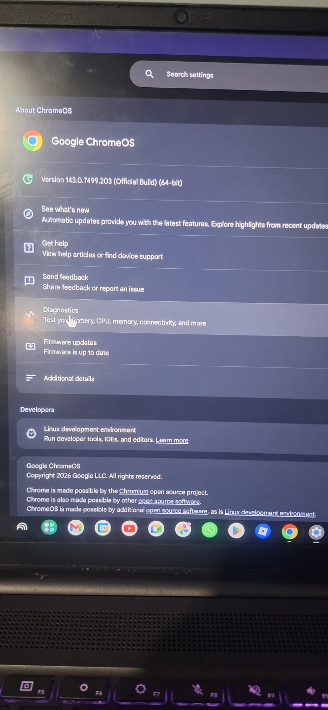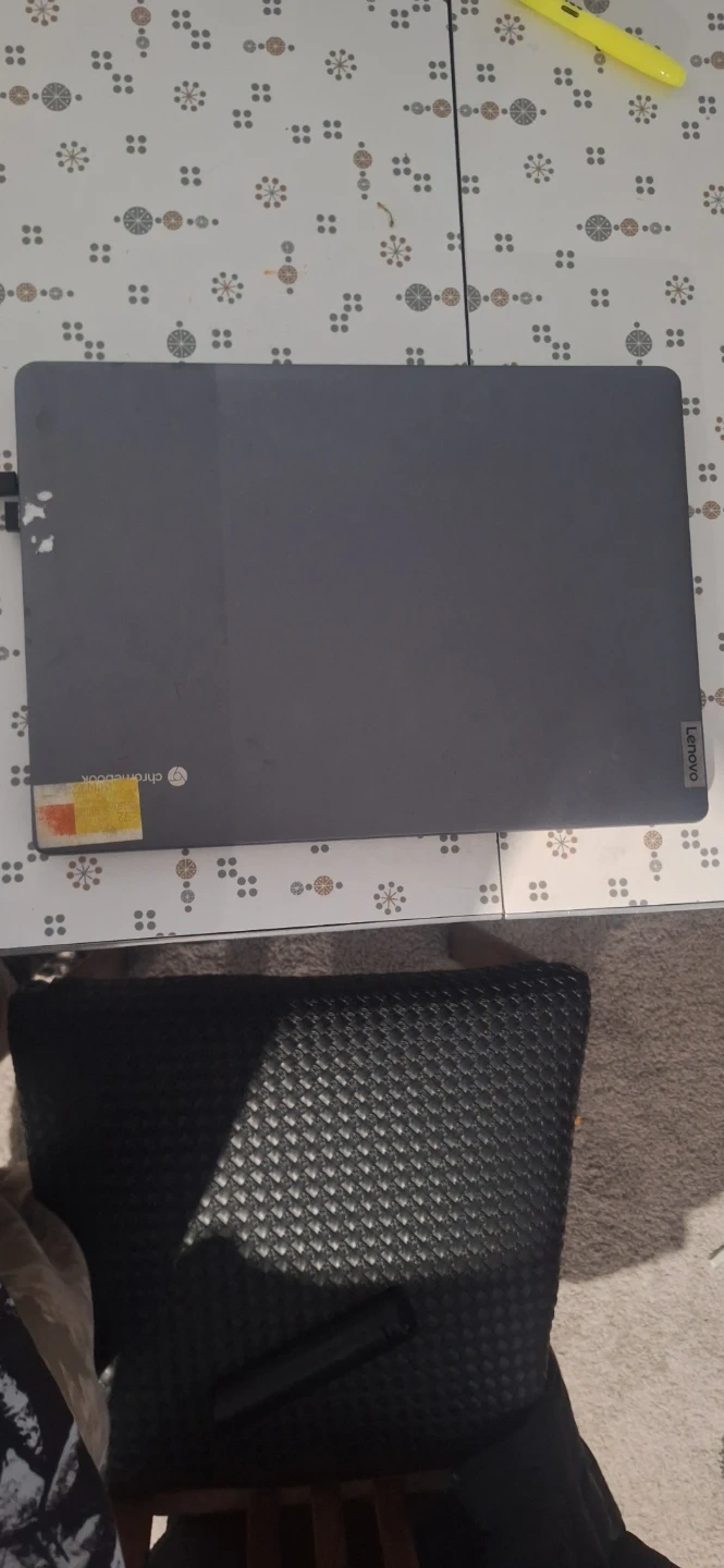 This is a Lenovo Chromebook laptop. It runs Google ChromeOS version 143. It's a 64-bit system. The device is grey and comes with a power adapter.