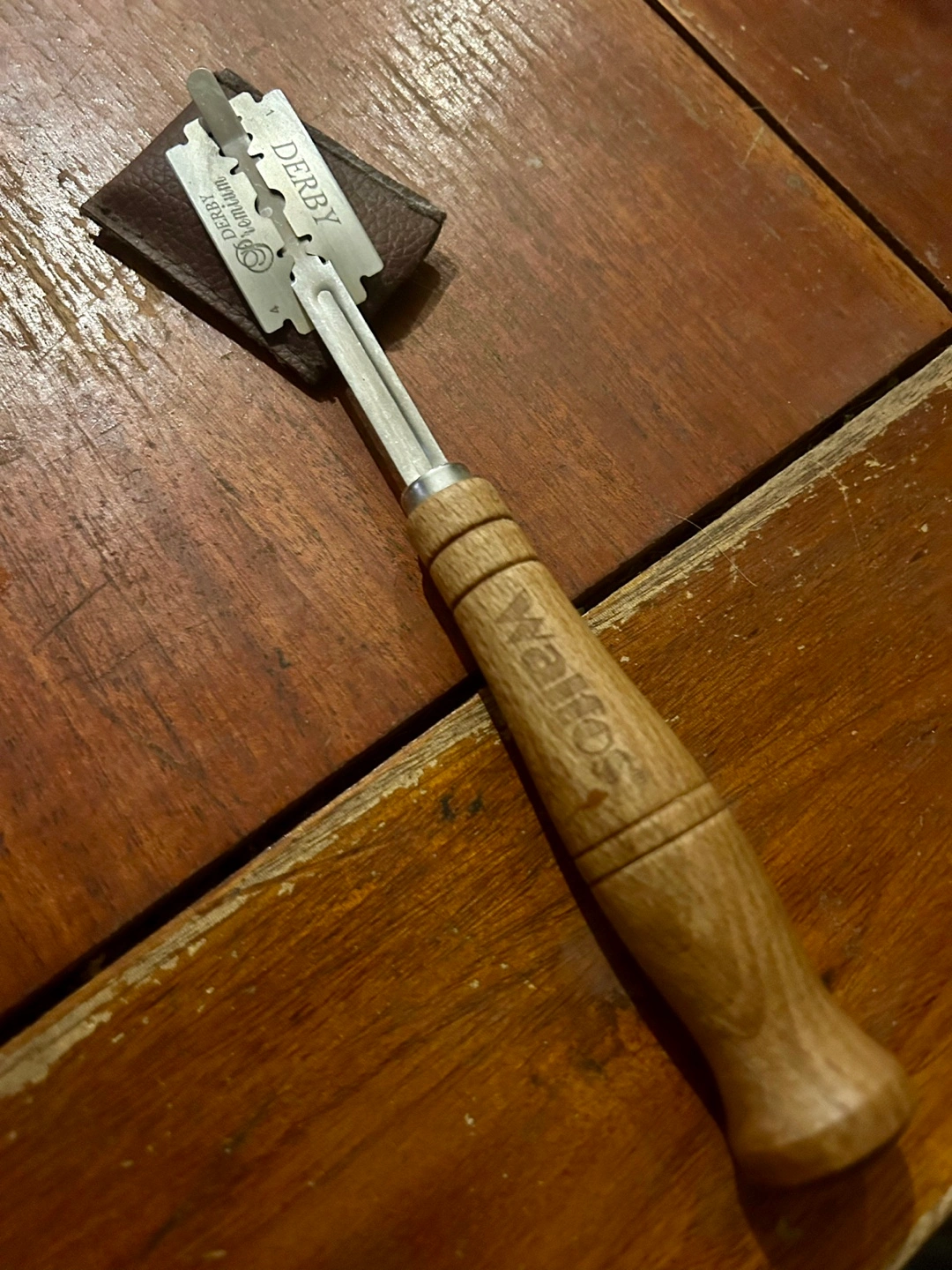 This is a used bread lame, a baker's dough scoring tool with a wooden handle and a replaceable blade, perfect for creating decorative cuts in bread dough.