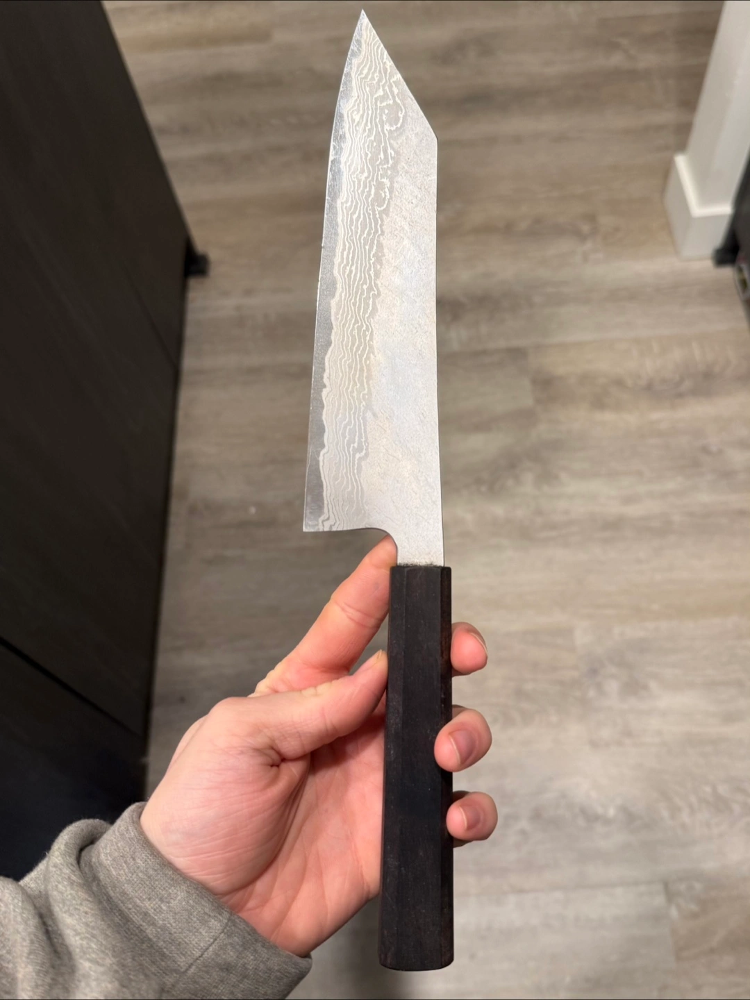 This is a Nigara VG10 Damascus Bunka knife with a 180mm blade. It features a Tsuchime hammered finish and a VG10 steel core. The handle is made of dark wood.