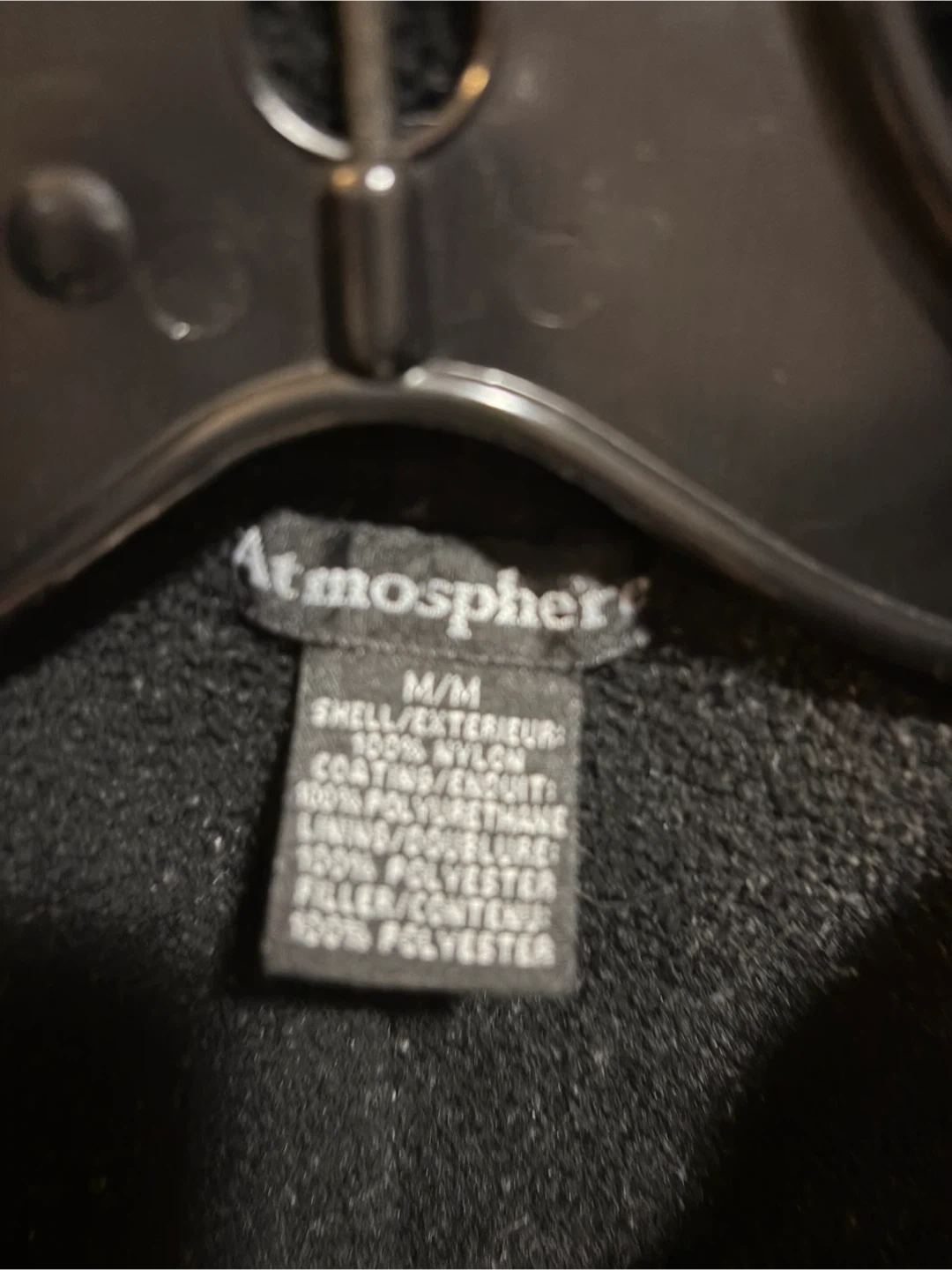 1000+Here's a gently used Atmosphere puffer vest in size M/M. It's made with 100% nylon for the shell and 100% polyester for the lining and filler. Great for layering! Solid black. Pick up @ midtown or downtown🤗