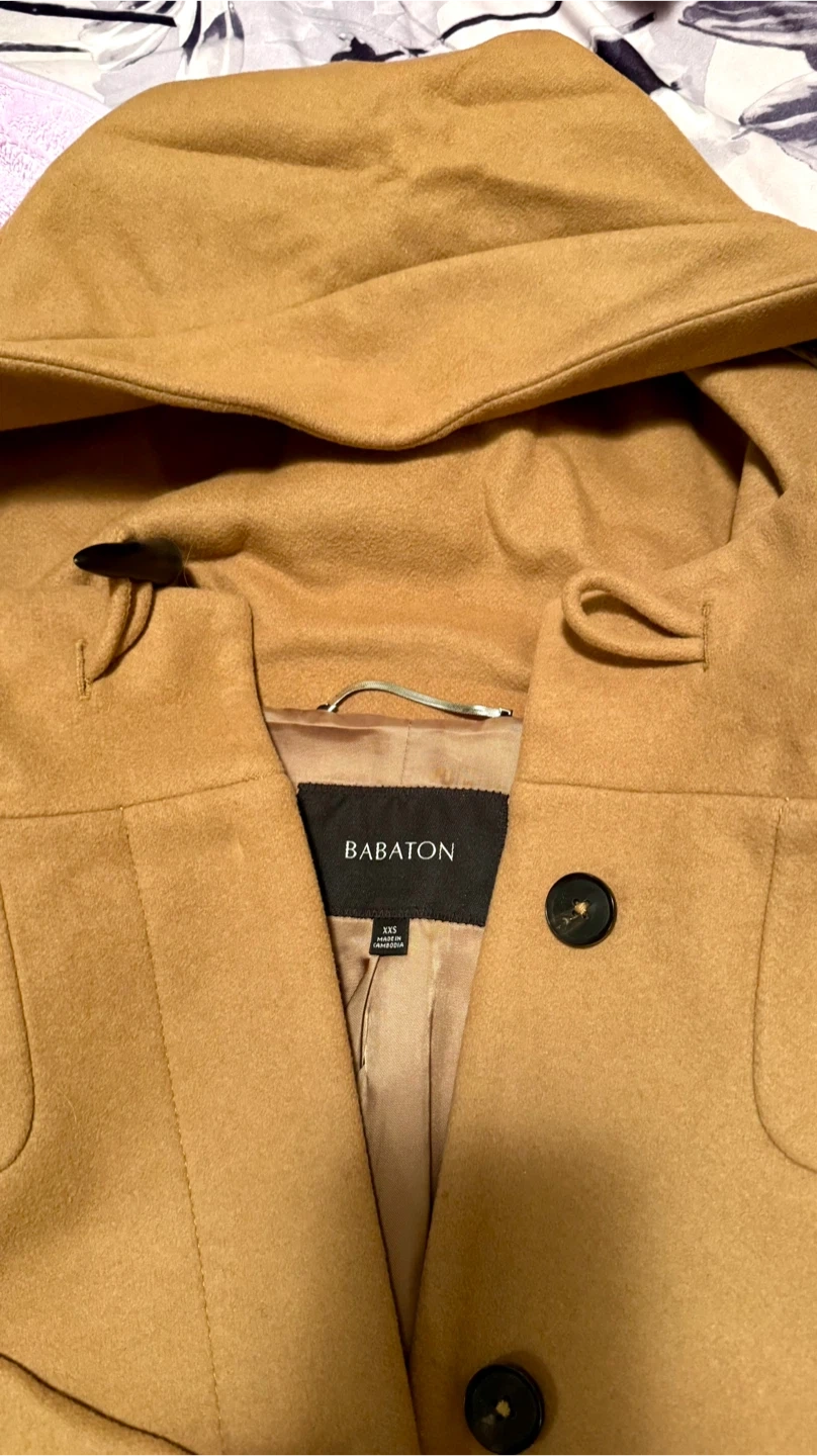 Selling a Babaton Pearce Coat XXS. It's a beautiful, stylish coat that's perfect for the cooler weather. The coat features a hood and is a lovely tan colour. It's in great condition, worn a couple of times.
