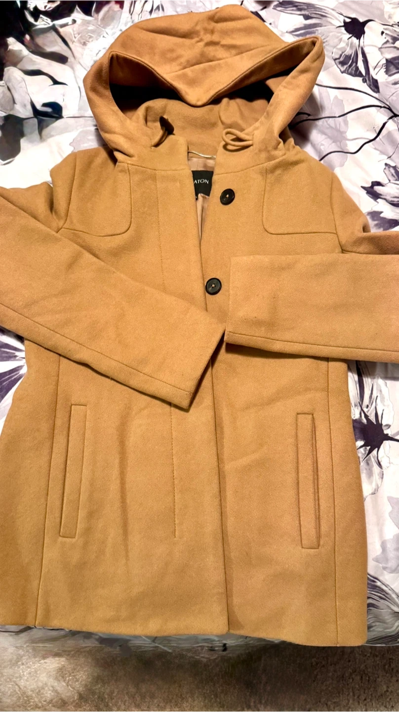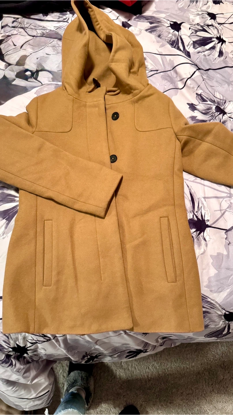 Selling a Babaton Pearce Coat XXS. It's a beautiful, stylish coat that's perfect for the cooler weather. The coat features a hood and is a lovely tan colour. It's in great condition, worn a couple of times.
