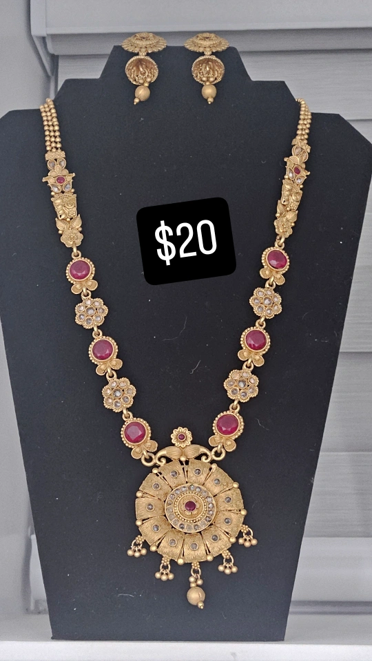 Beautiful gold-toned necklace and earring set for sale! The set features red stones and intricate floral designs. Perfect for adding a touch of elegance to any outfit. Selling for $20
