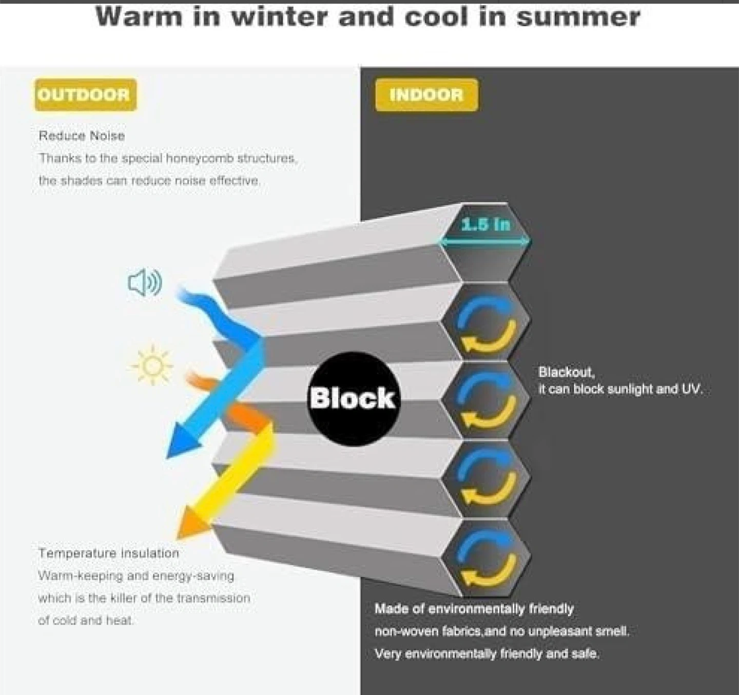 These cellular shades offer excellent temperature insulation and noise reduction thanks to their honeycomb structure. They're made from environmentally friendly non-woven fabrics and provide 100% blackout capabilities, blocking sunlight and UV rays. Installation is easy with a no-drill system.