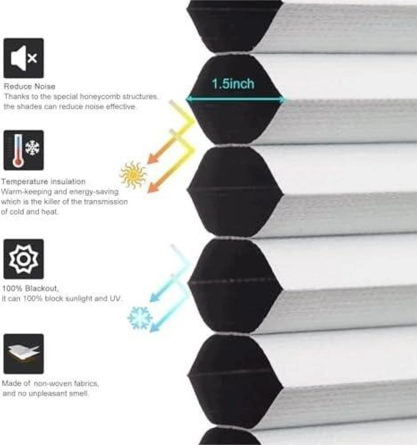 These cellular shades offer excellent temperature insulation and noise reduction thanks to their honeycomb structure. They're made from environmentally friendly non-woven fabrics and provide 100% blackout capabilities, blocking sunlight and UV rays. Installation is easy with a no-drill system.