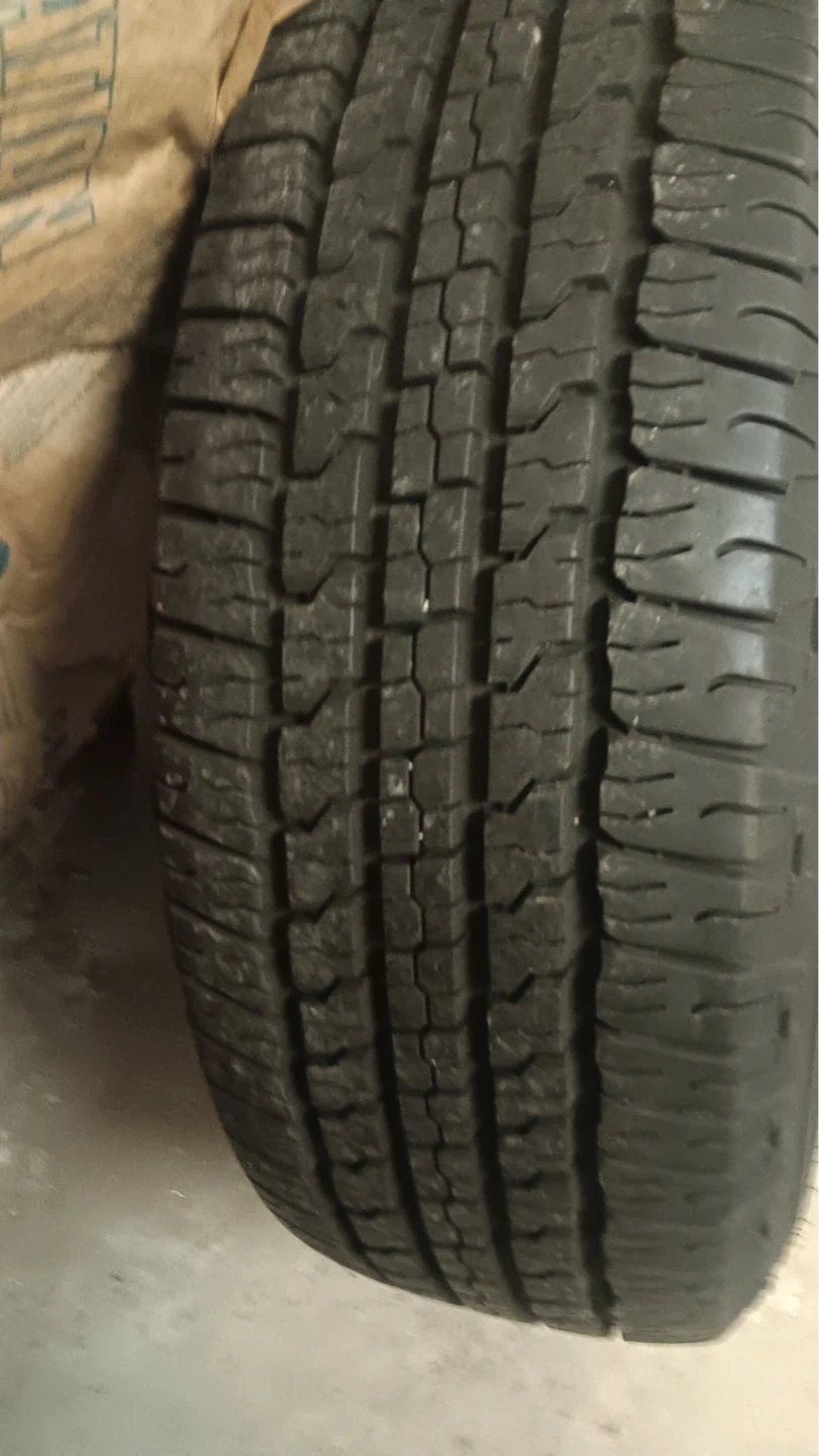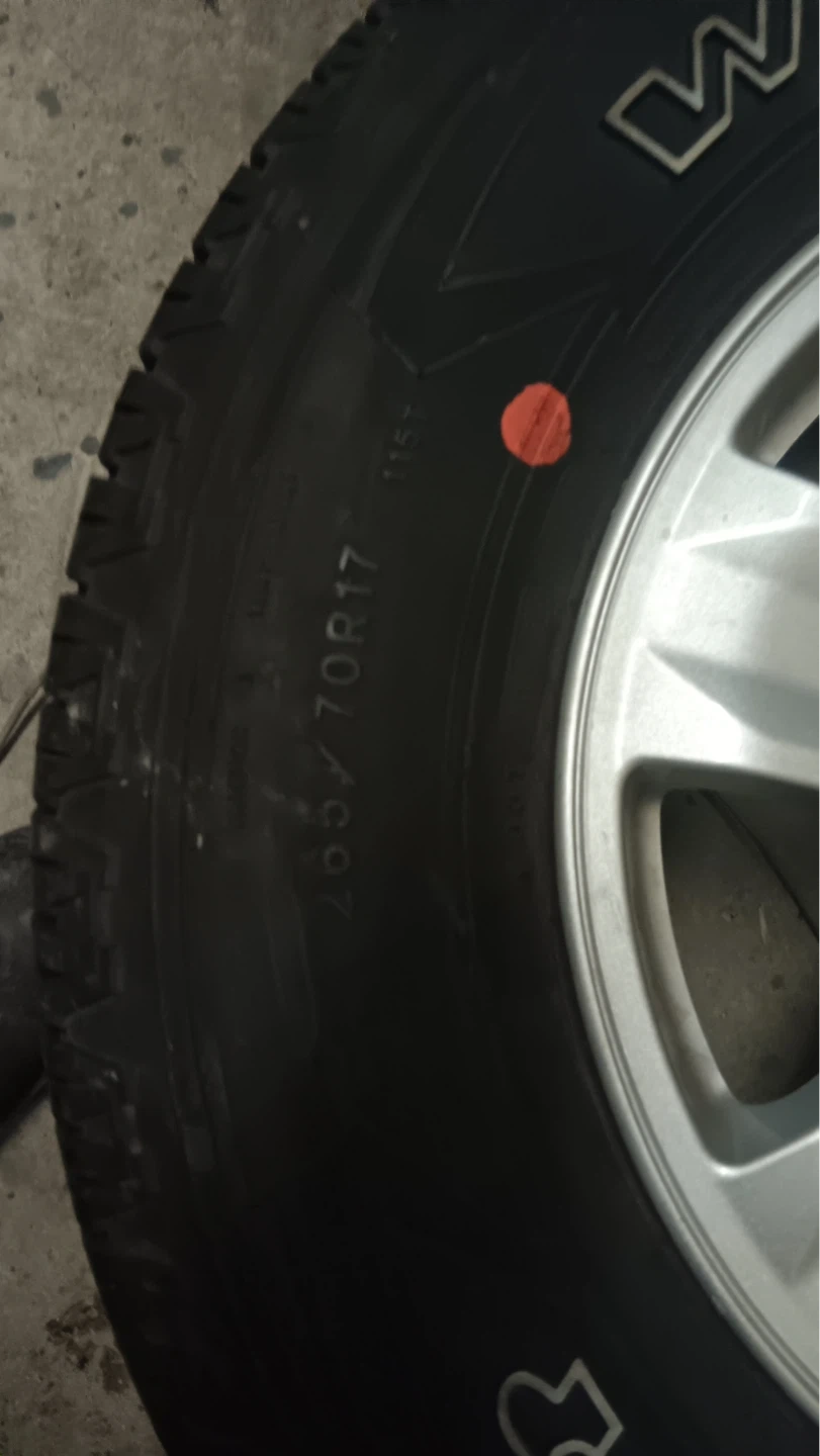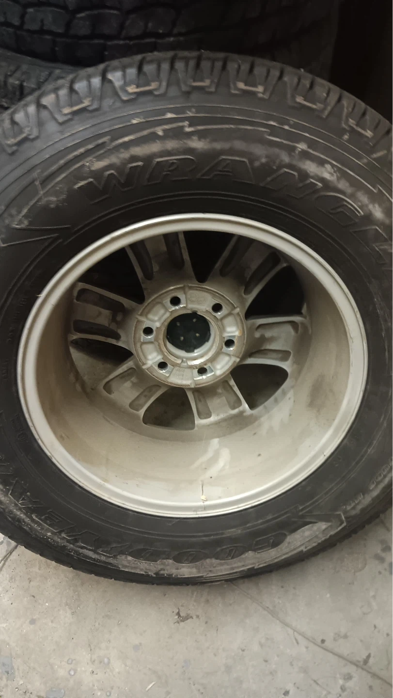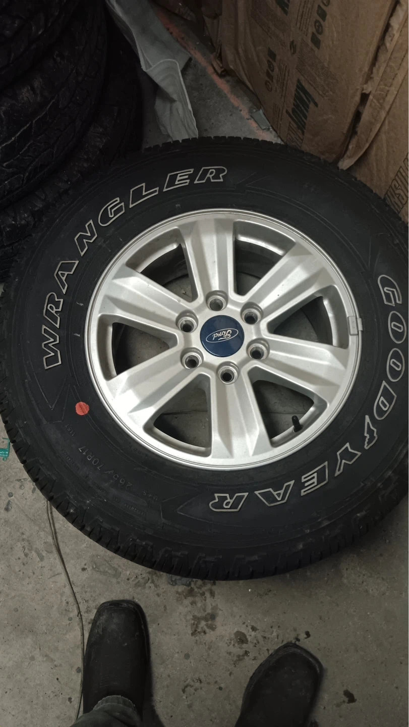 3 Goodyear Wrangler tires mounted on Ford rims . Tire size is 265/70R17. These are great for trucks and SUVs!
