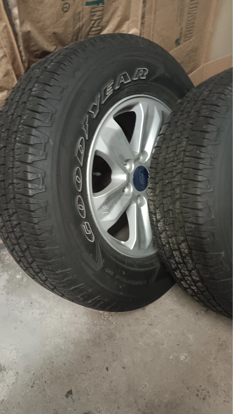 3 Goodyear Wrangler tires mounted on Ford rims . Tire size is 265/70R17. These are great for trucks and SUVs!