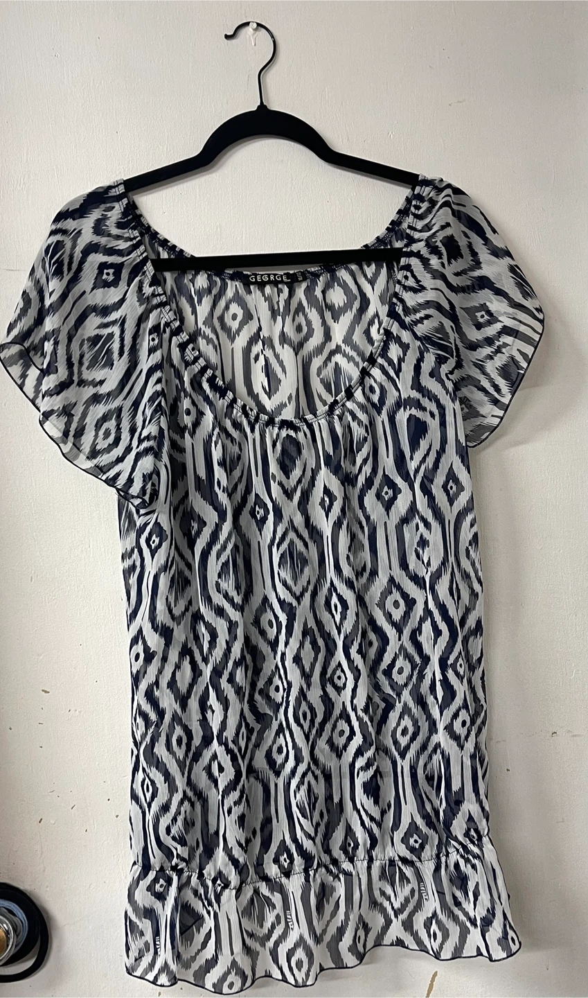 Item details: women's blouse, sheer w/ ikat-style print in navy and with. Cinched waist that adds a short peplem. Light and airy. Perfect for the warmer weather. A cute top to add a little pattern to an outfit.