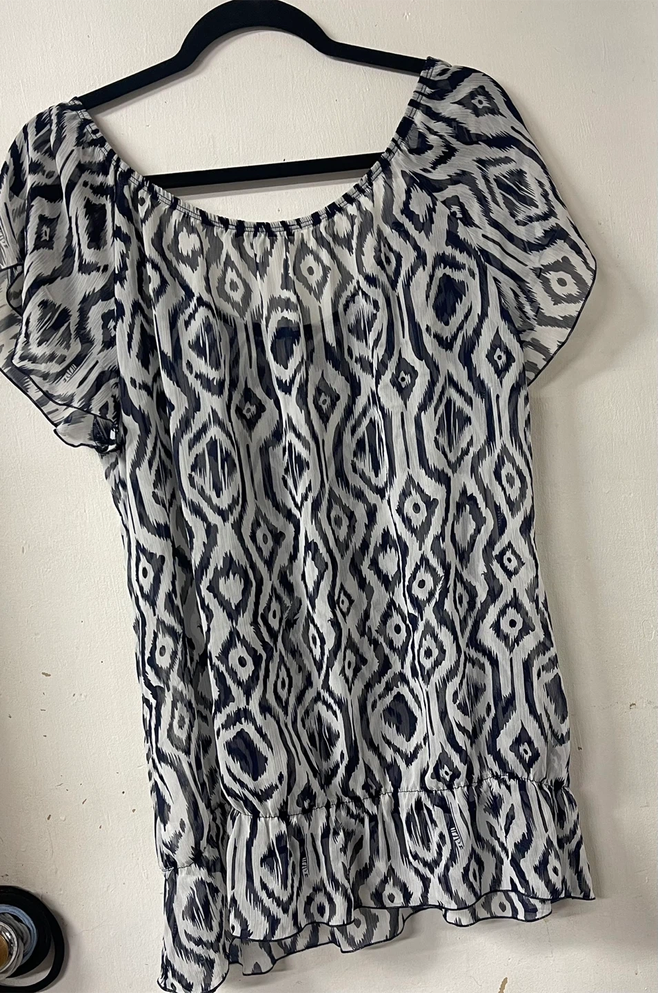 Item details: women's blouse, sheer w/ ikat-style print in navy and with. Cinched waist that adds a short peplem. Light and airy. Perfect for the warmer weather. A cute top to add a little pattern to an outfit.