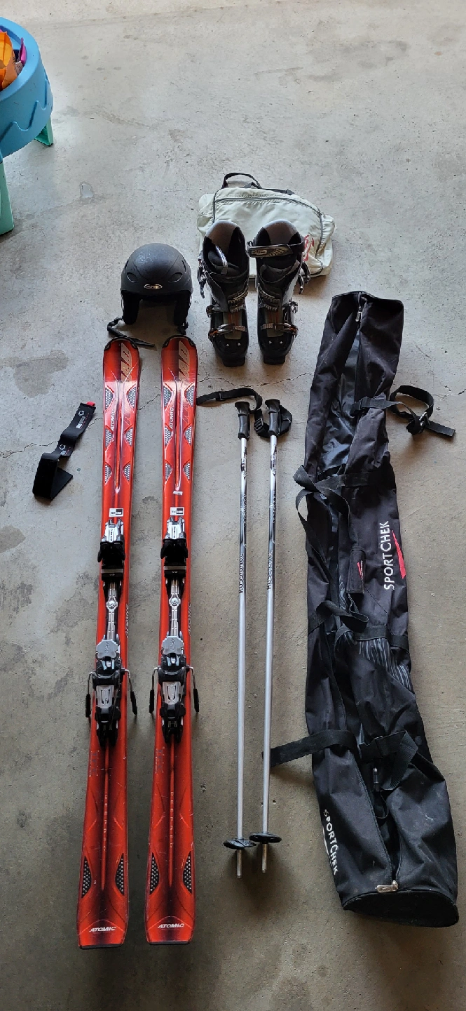 10Complete ski set ready for the slopes! Includes Atomic skis, ski boots, poles, and an Alpina helmet. Also comes with a Sportchek bag for easy transport. Great for anyone looking to get into skiing or upgrade their current gear