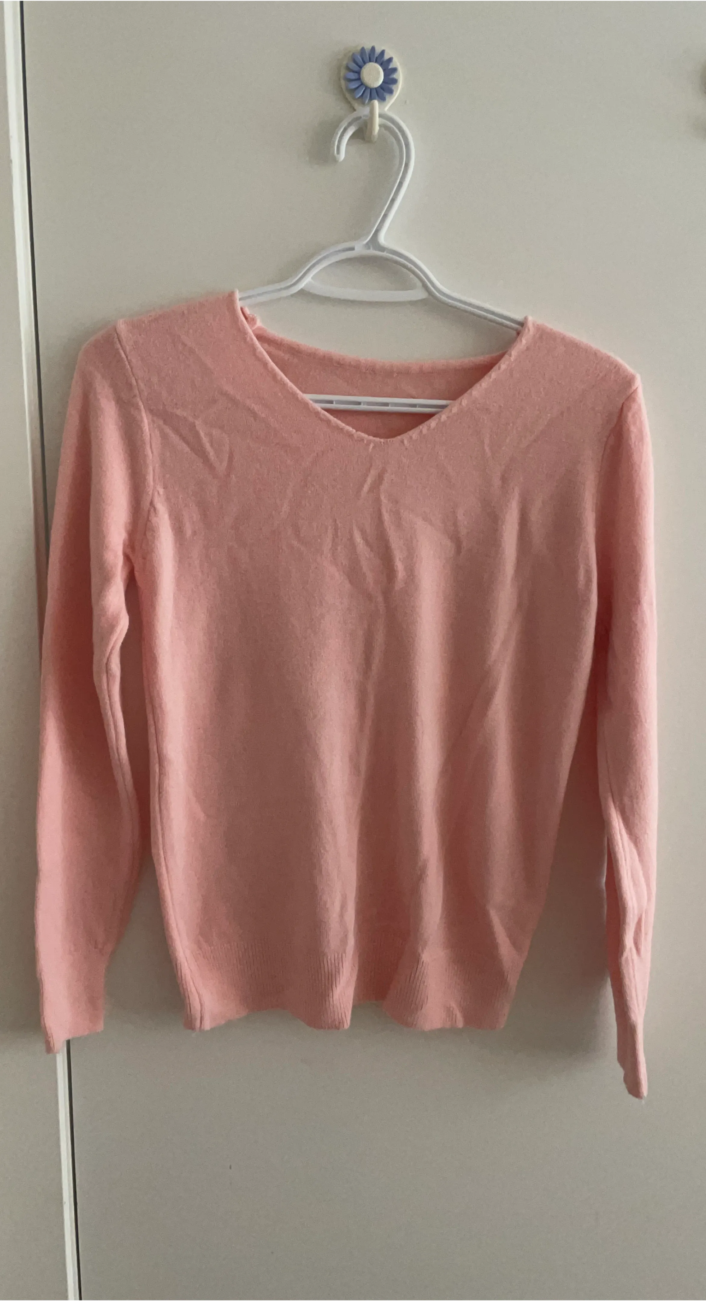 This is a soft pink V-neck sweater. It's a long-sleeved knit. Perfect for layering or wearing on its own!
