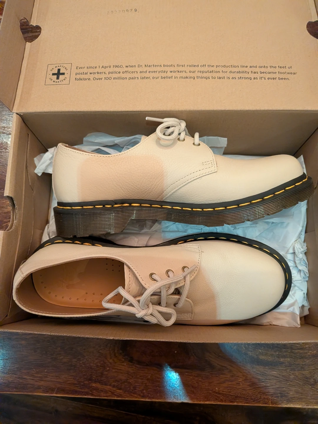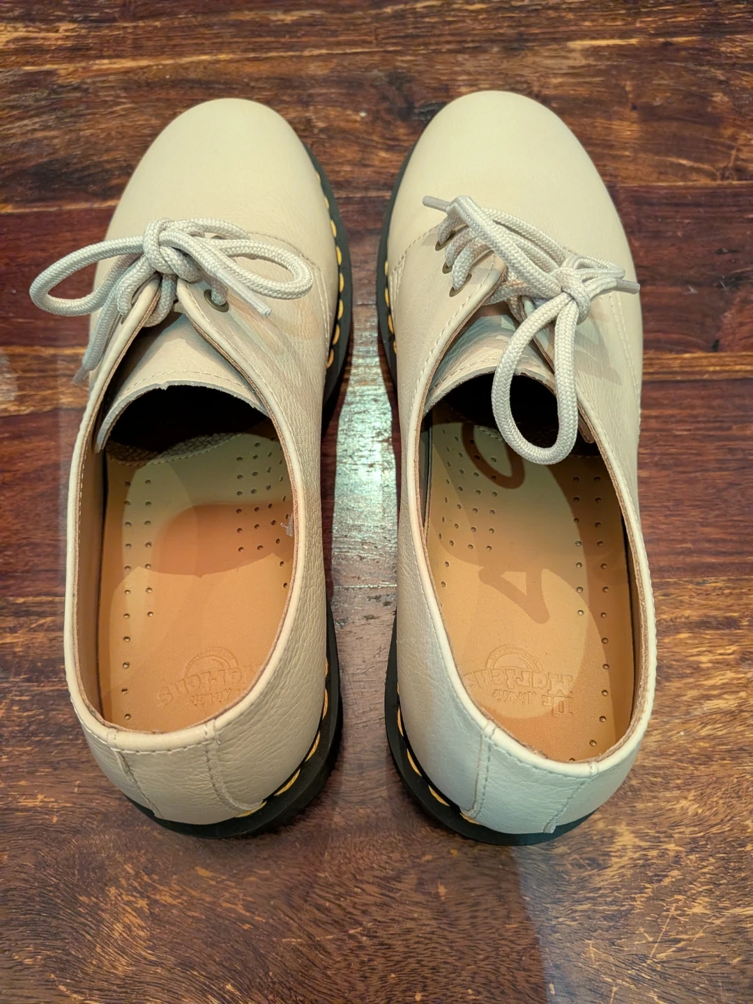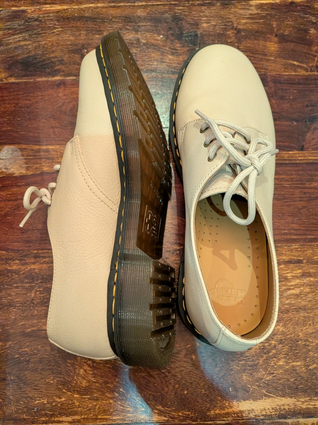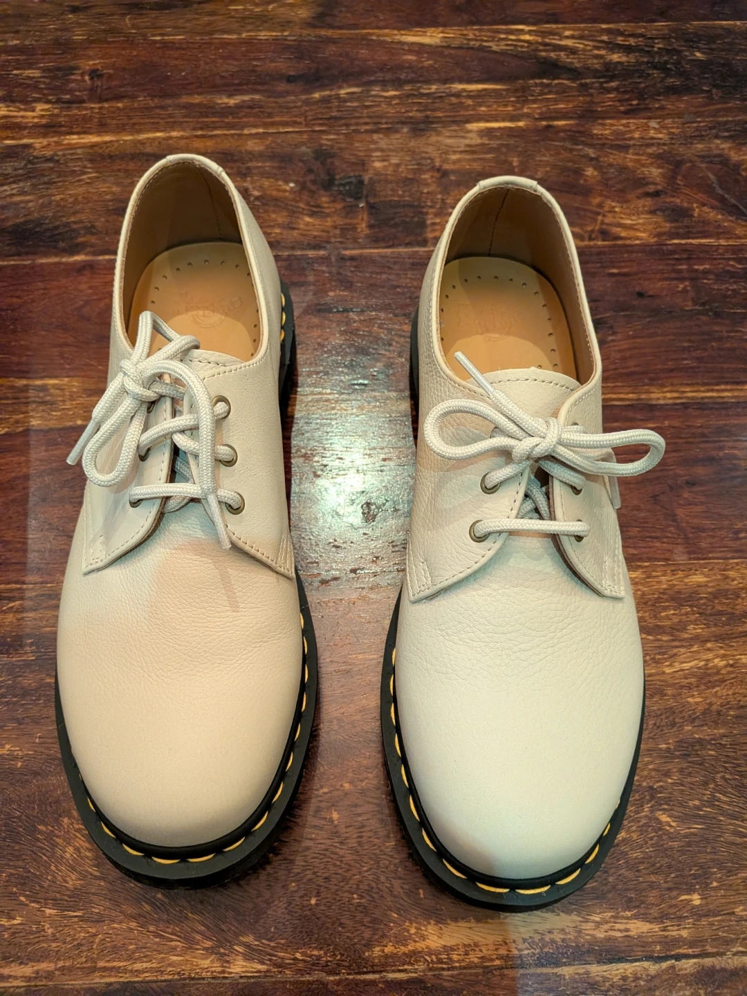 Perfect for Spring! Dr. Martens 1461 shoes in parchment cream. These leather Oxford shoes feature the classic yellow welt stitching and air-cushioned sole. Comes with original box.