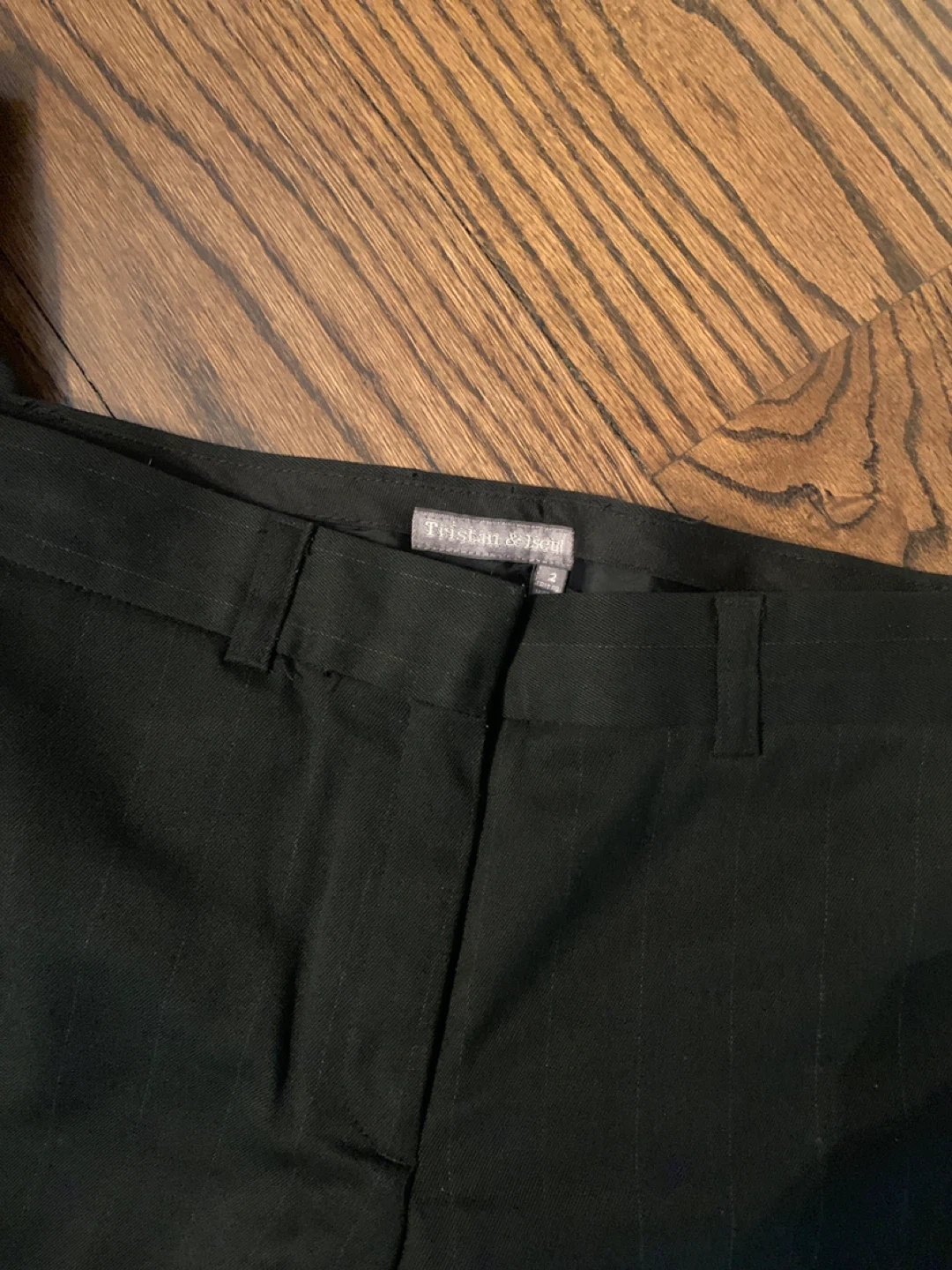 This Tristan & Belle set includes a black pinstripe vest and matching pants. The vest has a double-breasted button closure. Pants feature a button and zip closure. Both pieces are made from a polyester blend. Size Xs-2