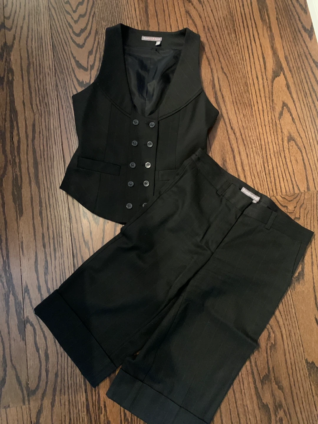 This Tristan & Belle set includes a black pinstripe vest and matching pants. The vest has a double-breasted button closure. Pants feature a button and zip closure. Both pieces are made from a polyester blend. Size Xs-2