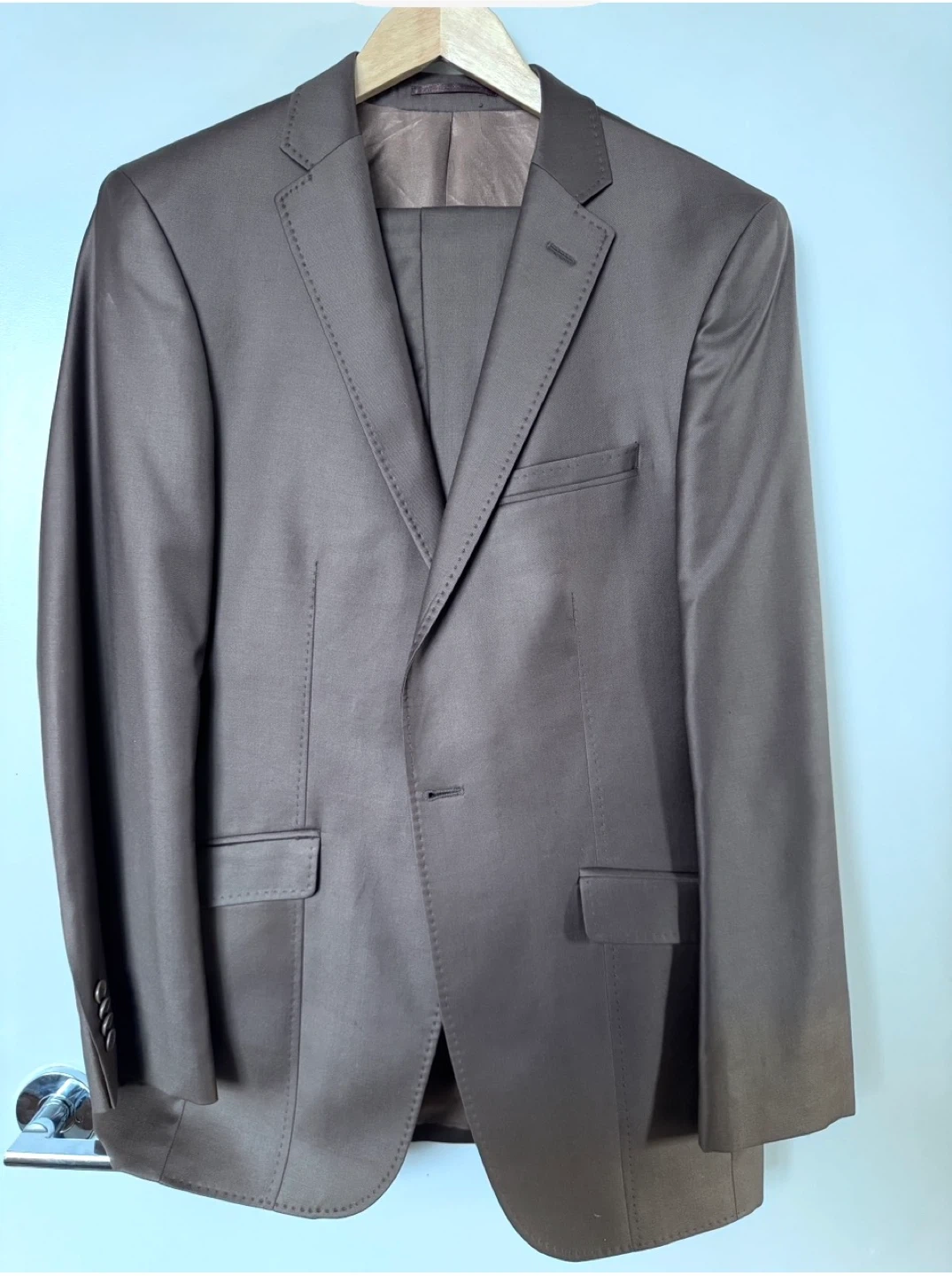 Selling a Cadini suit in size 48. The colour is a nice brown. The lining is acetate twill. It's made of 90% wool and 10% poly. It's a classic model with a one-button closure