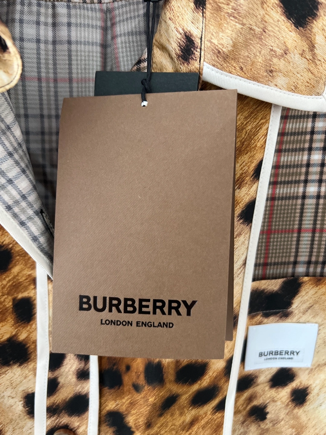 Here's a Burberry London England shirt. It features a unique design with a combination of plaid and leopard print. The shirt has a pocket with the Burberry logo. Perfect for adding a touch of luxury to your wardrobe