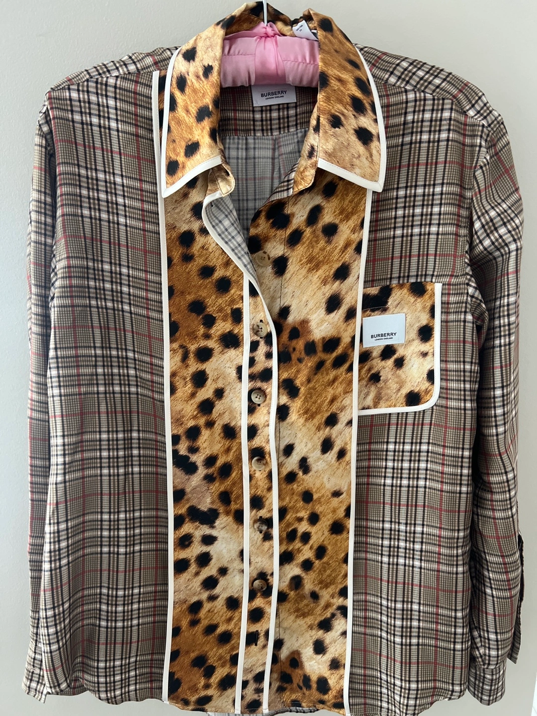 Here's a Burberry London England shirt. It features a unique design with a combination of plaid and leopard print. The shirt has a pocket with the Burberry logo. Perfect for adding a touch of luxury to your wardrobe