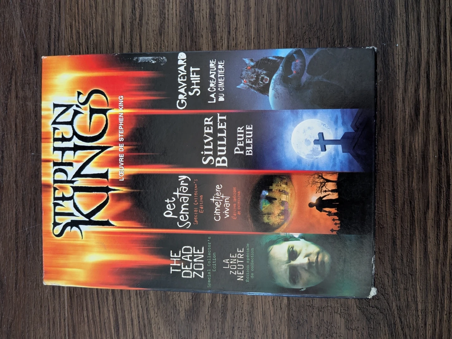 This is a collection of Stephen King movies on DVD. It includes The Dead Zone, Pet Sematary, Silver Bullet, and Graveyard Shift. The discs are in their cases.