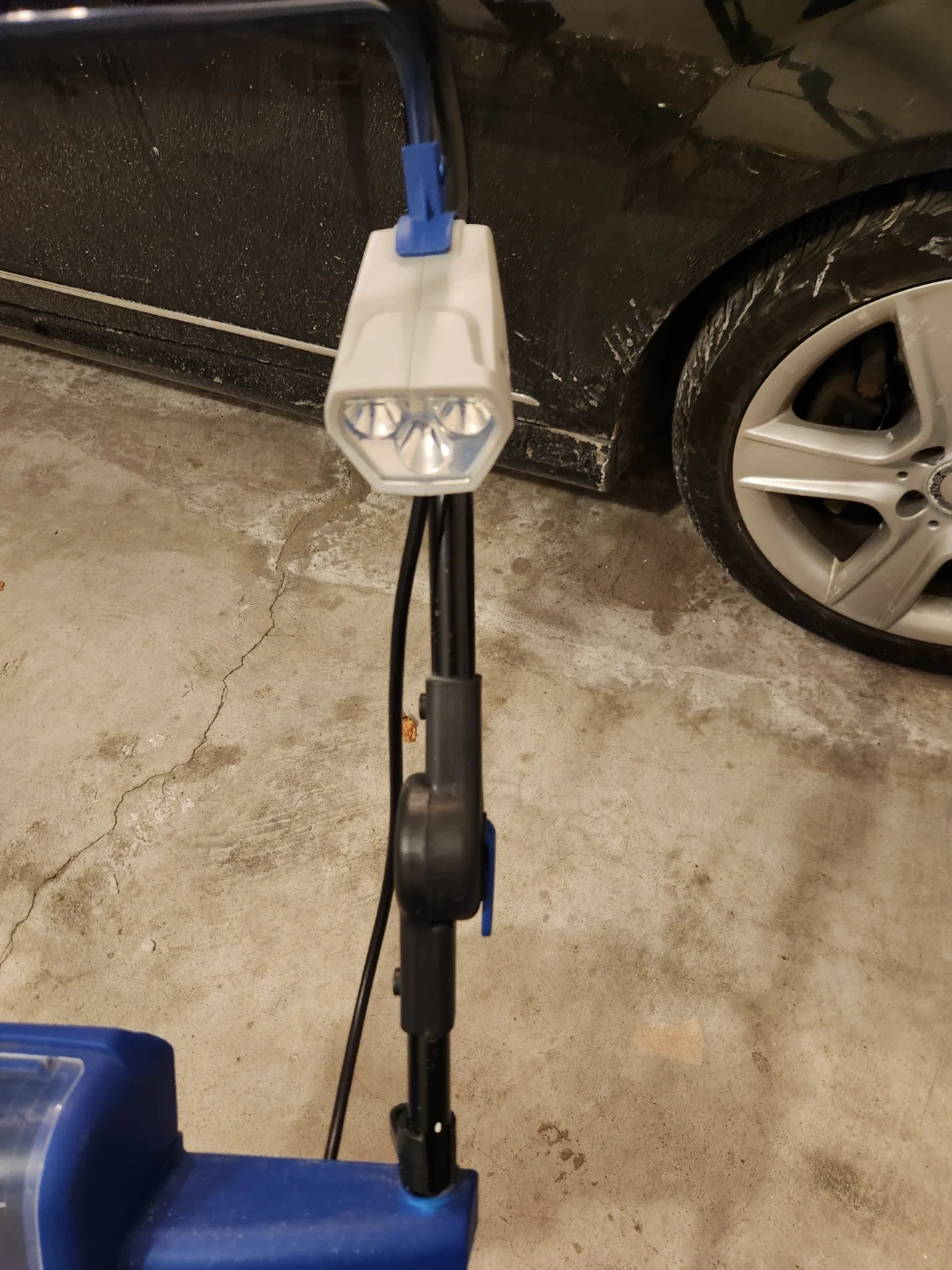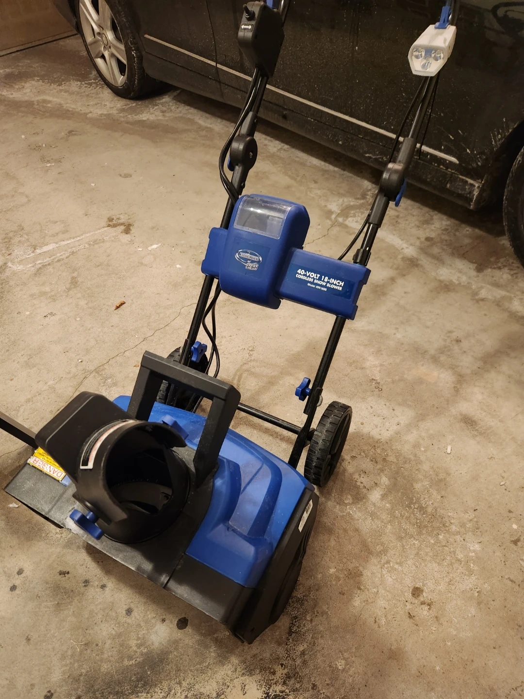 This Snow Joe ION 40-volt cordless snow blower features an 18-inch clearing width. It's designed for clearing snow from pathways and driveways. Includes LED lights for visibility. Battery and charger included.