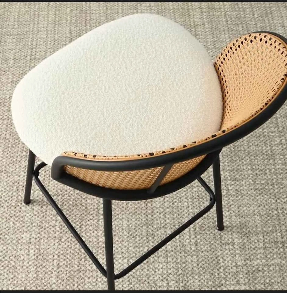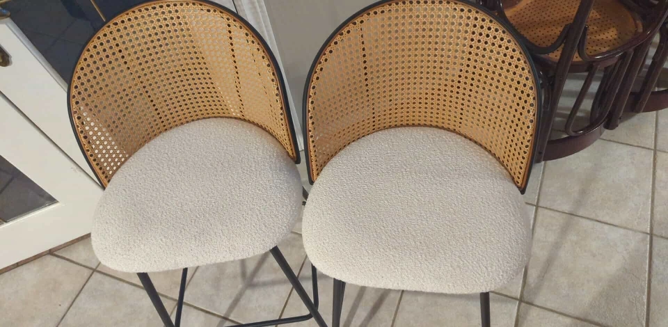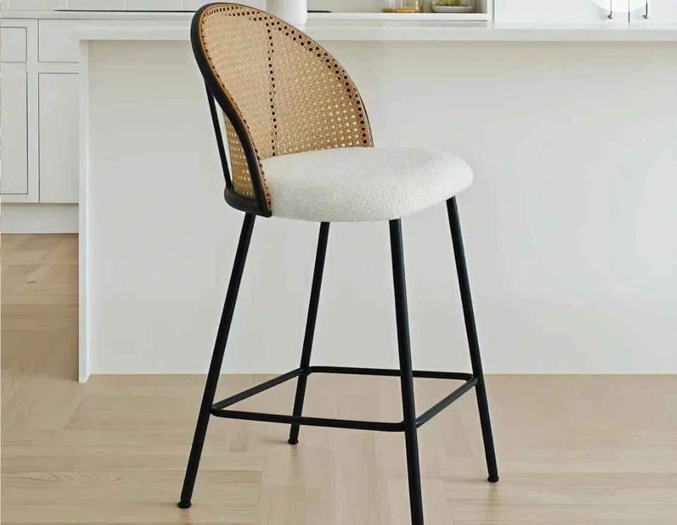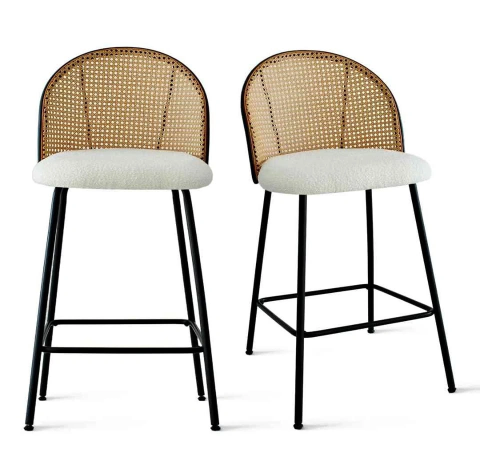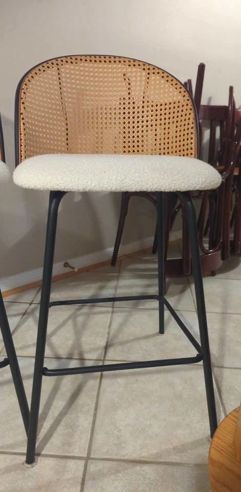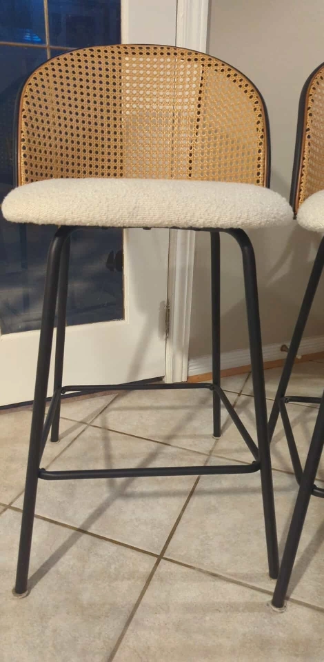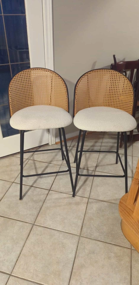 Set of 2 Modern Bar Stools – Cane Back & Upholstered Seat. Add style and comfort to your kitchen or bar area with this beautiful set of 2 bar stools. Featuring a woven cane backrest, cozy cushioned seat in a soft cream fabric, and sleek black metal legs, these stools are the perfect mix of modern and boho design. ✅ Comfortable padded seats ✅ Sturdy black metal frame with footrest ✅ Neutral tones to fit any décor ✅ Great for kitchen islands, counters, or bar spaces 📏 Approx. Dimensions: see photo ✨ Excellent condition – barely used! 💲 Price: $300 for the set of 2 📍 Pickup in Vaughan
