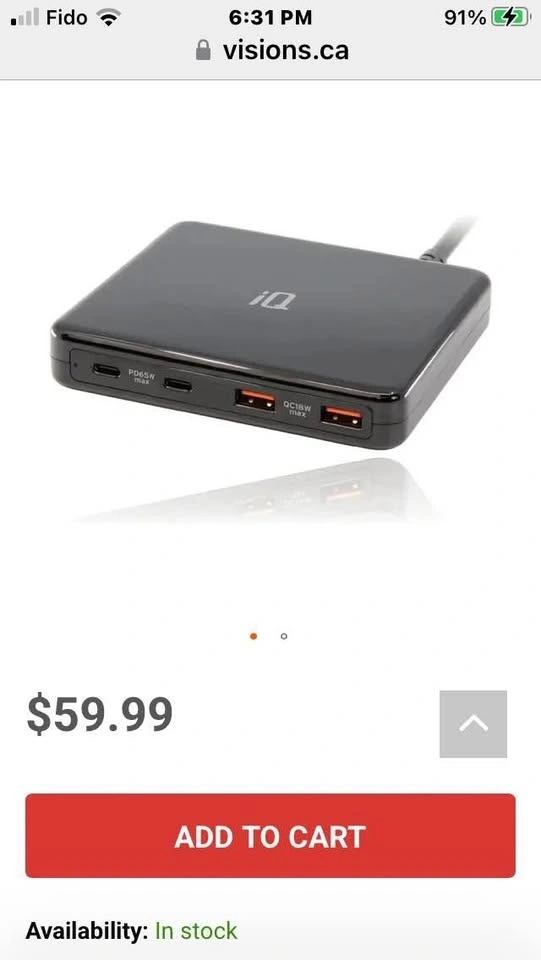 Brand new in sealed box iQ 65W Desktop Charging Station (IQCHRSTN5). Features Total Combined Maximum Output: 65W. 2x USB-Power Delivery (USB-PD) USB Type-C Ports: Maximum 65W (PD 65) per port. 2x Quickcharge 3.0 (QC) Charging Ports: Maximum 18W per port. Smart IC intelligent self-sensing technology automatically distributes power based on device requirements. Please see photos. Cash only. Smoke and pet free home. Pick up in the Warden and Highway 7 area in Markham.