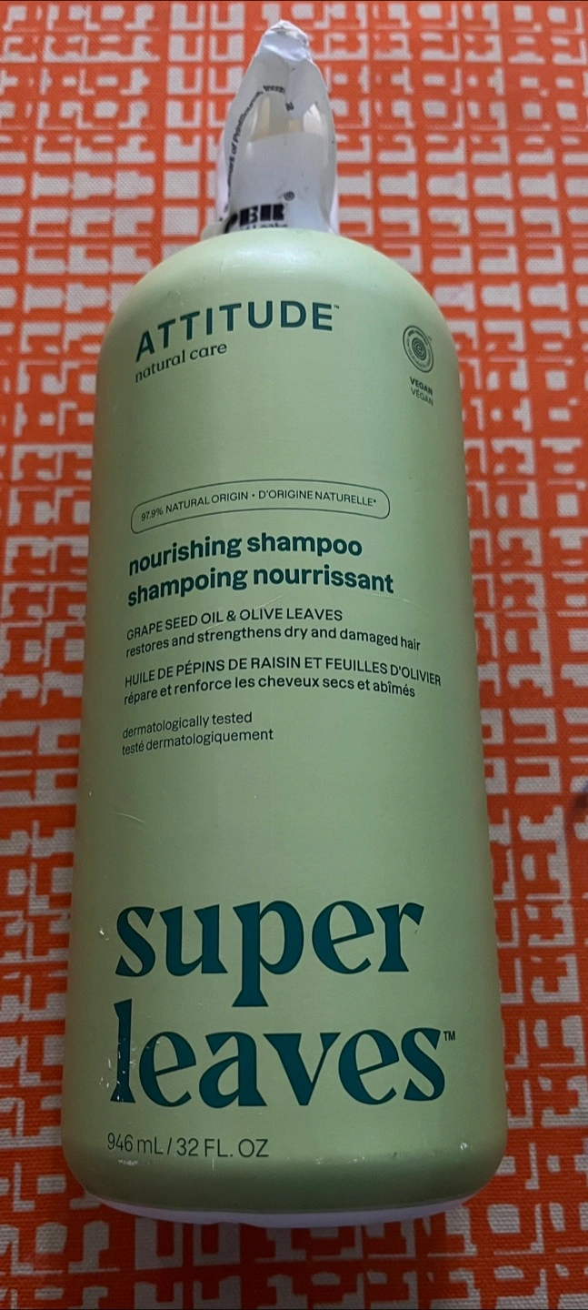 461I'm selling a bottle of Attitude Super Leaves nourishing shampoo. It's a large 946 mL bottle. This shampoo is made with grape seed oil and olive leaves to restore and strengthen dry and damaged hair. It's also dermatologically tested