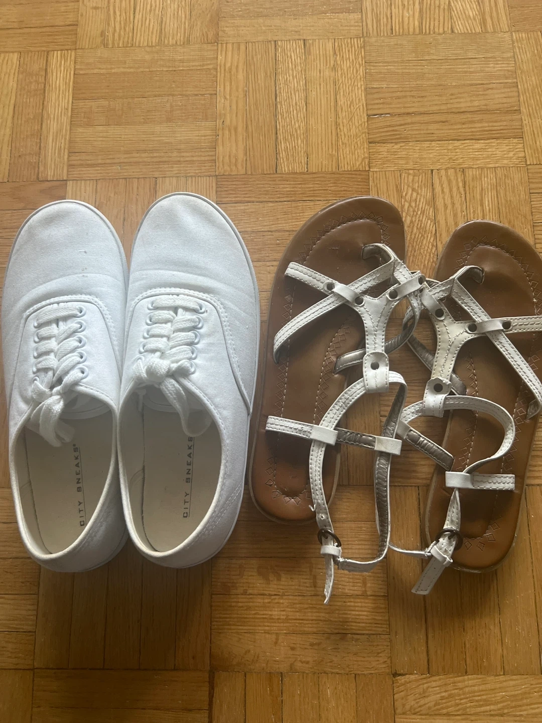 Selling a pair of City Sneaks white sneakers and a pair of sandals. Both are in good condition and ready for a new owner