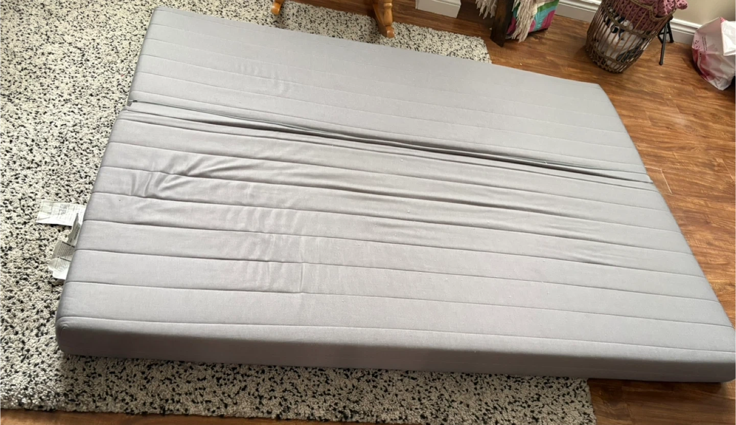 Grey foldable foam mattress. It's made of foam and has a soft fabric cover. Perfect for unexpected guests or small spaces!