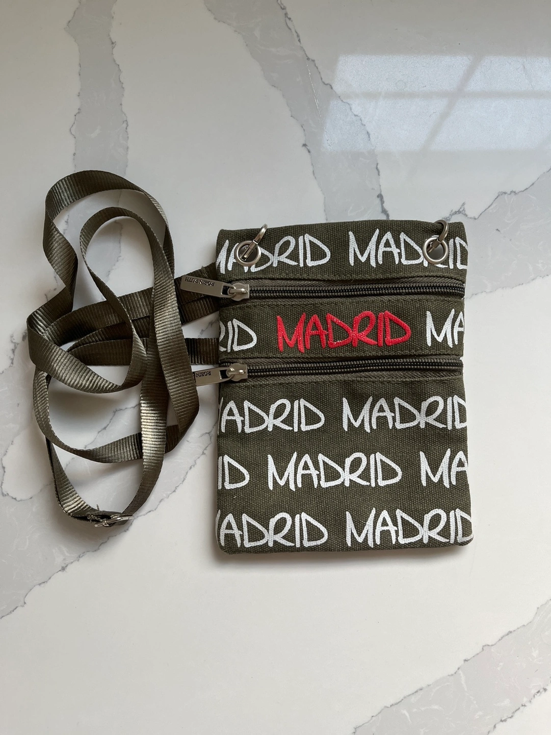 Small crossbody bag that says Madrid all over. Was a souvenir from a friend years ago, however I don’t reach for it. Is an olive green colour with white/red writing. Has two pockets to fit all your items. Strap is adjustable.