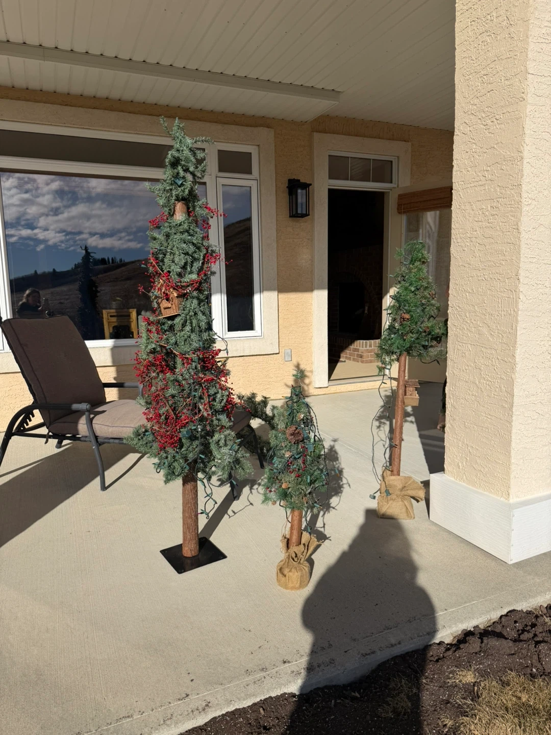 Decorated artificial Christmas trees for outdoor or indoor use. Includes lights and berry accents. Comes in various sizes.