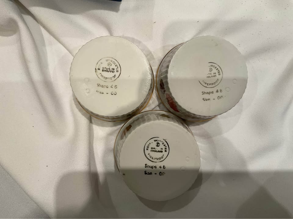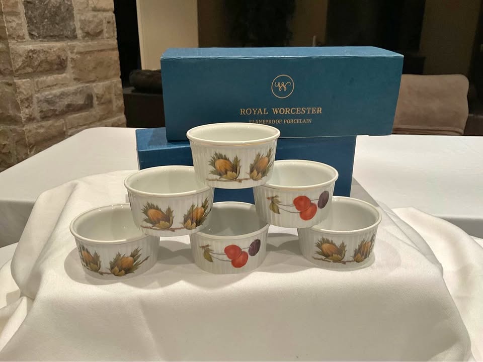 Brand new in box, never used Royal Worcester ramekins set of 6 flameproof porcelain dishes. Features super cute hazelnut and cherry designs. Comes in original box. Smoke-free, pet-free home.