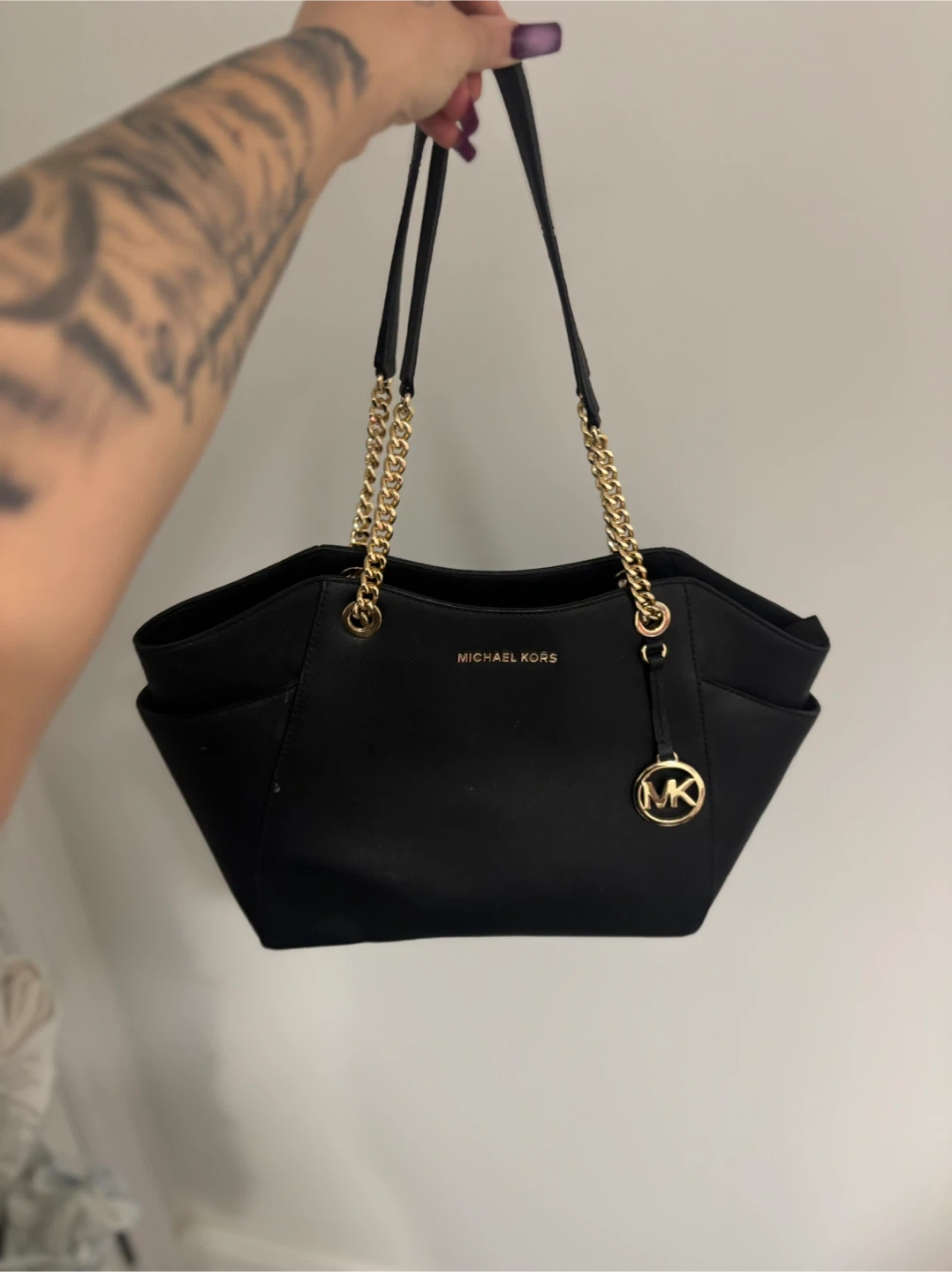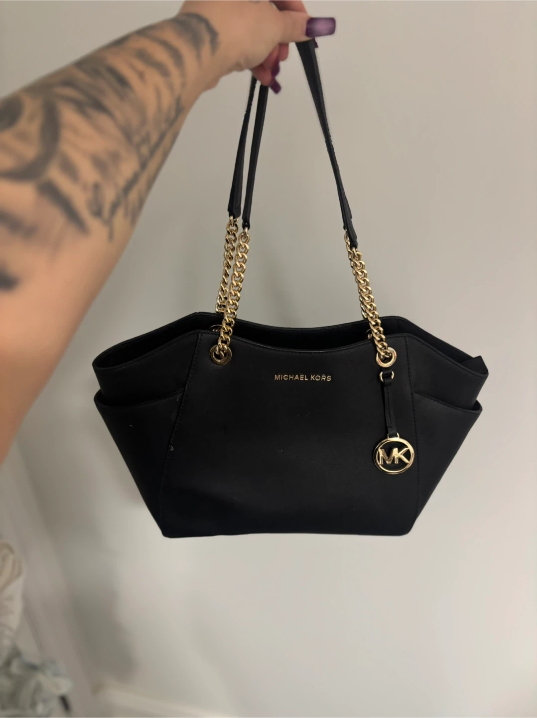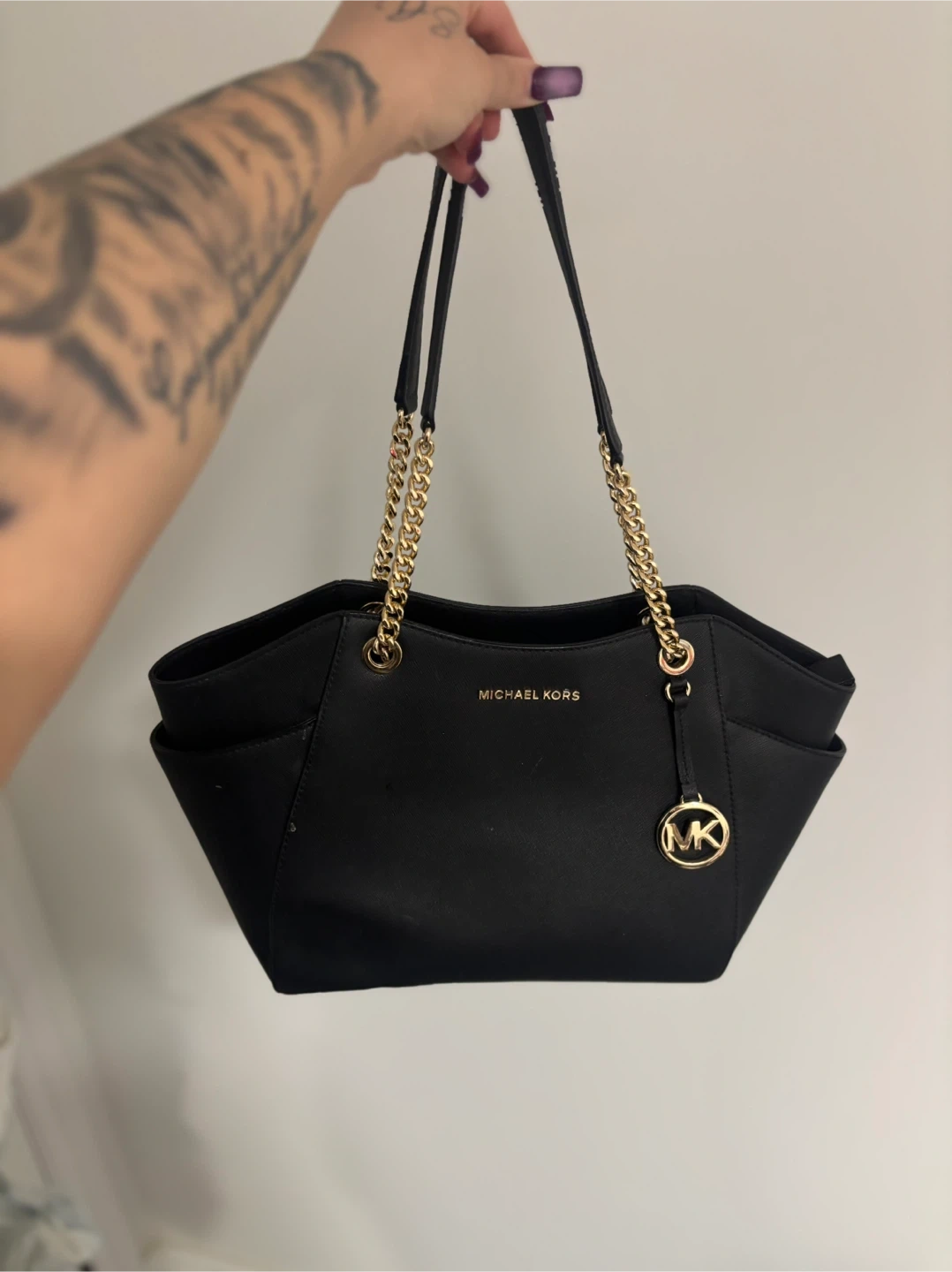 A classic black tote bag from Michael Kors. It features gold chain accents on the straps and the signature MK charm. Plenty of space for all your essentials!