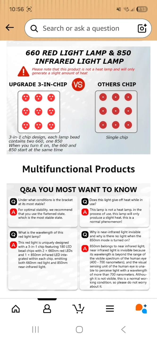 This Shinyeyou red light lamp features 180 LEDs with 850nm & 660nm wavelengths. It has a flexible tripod stand adjustable from 15" to 60" tall. The device uses a 3-in-1 chip design for optimal performance. It's safe for home use without worrying about overheating.