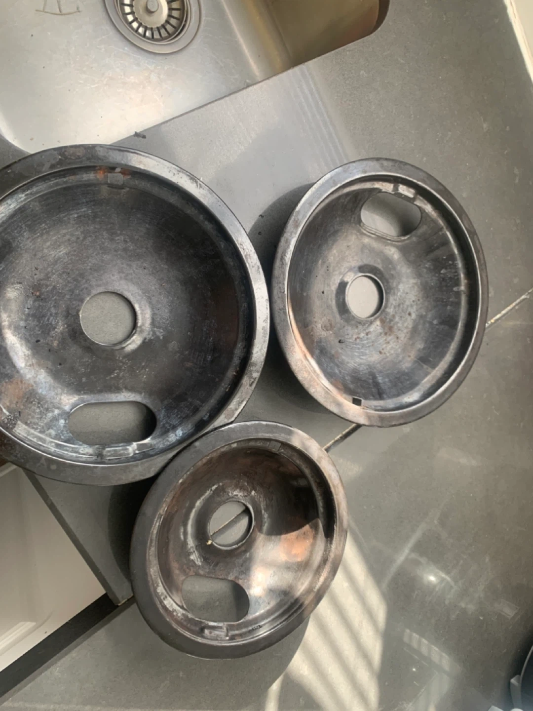 This is a set of three used drip pans for an electric stove. They are metal and show signs of use. They'd be useful for replacing worn-out pans on a stove. 3 for $35