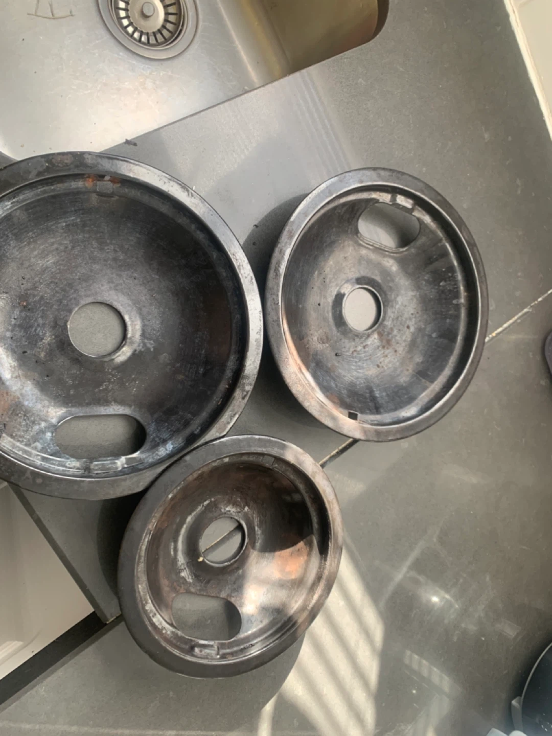 This is a set of three used drip pans for an electric stove. They are metal and show signs of use. They'd be useful for replacing worn-out pans on a stove. 3 for $35