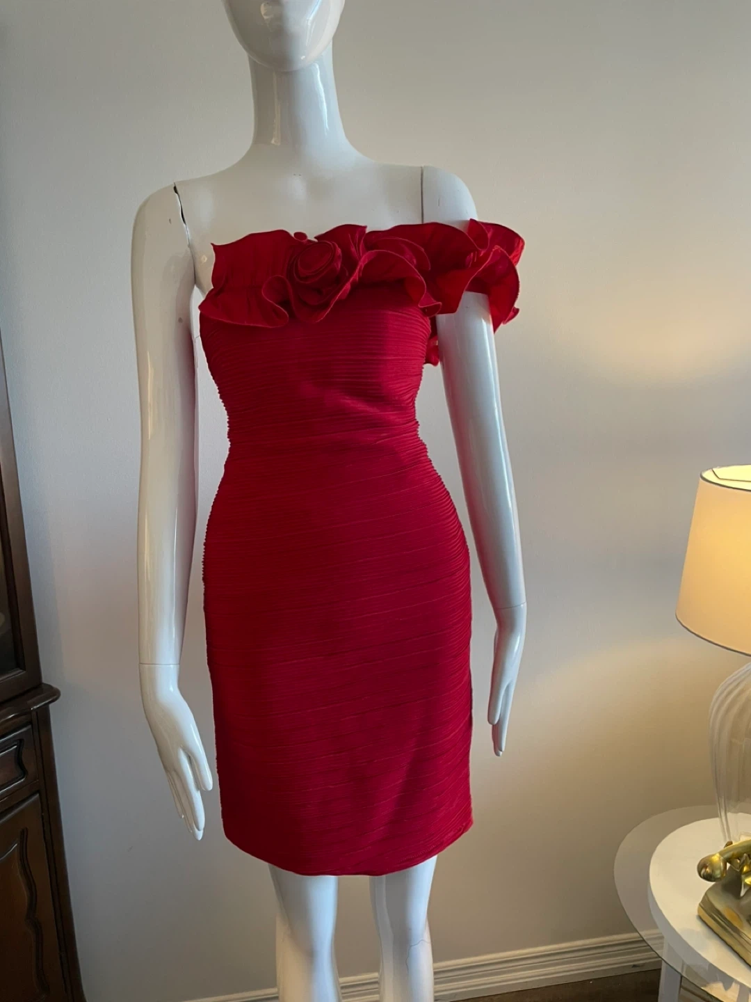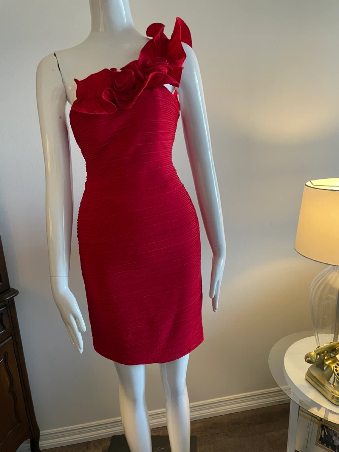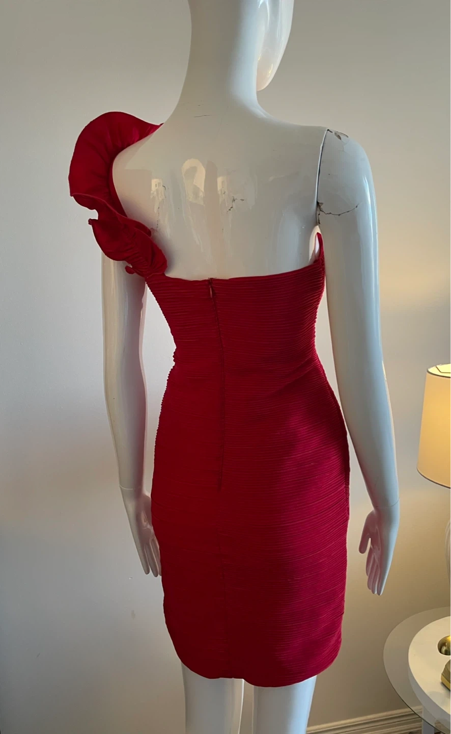 This striking red dress features a chic one-shoulder design adorned with a voluminous ruffle detail. Its bodycon silhouette is crafted from a textured, stretchy fabric that hugs your curves. It's perfect for a night out or a special occasion!
