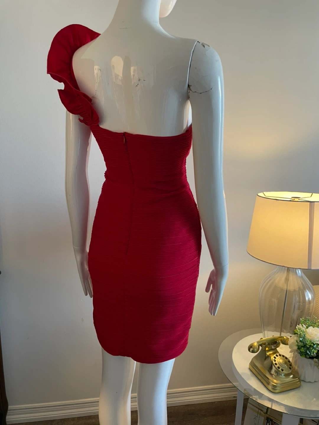 This striking red dress features a chic one-shoulder design adorned with a voluminous ruffle detail. Its bodycon silhouette is crafted from a textured, stretchy fabric that hugs your curves. It's perfect for a night out or a special occasion!
