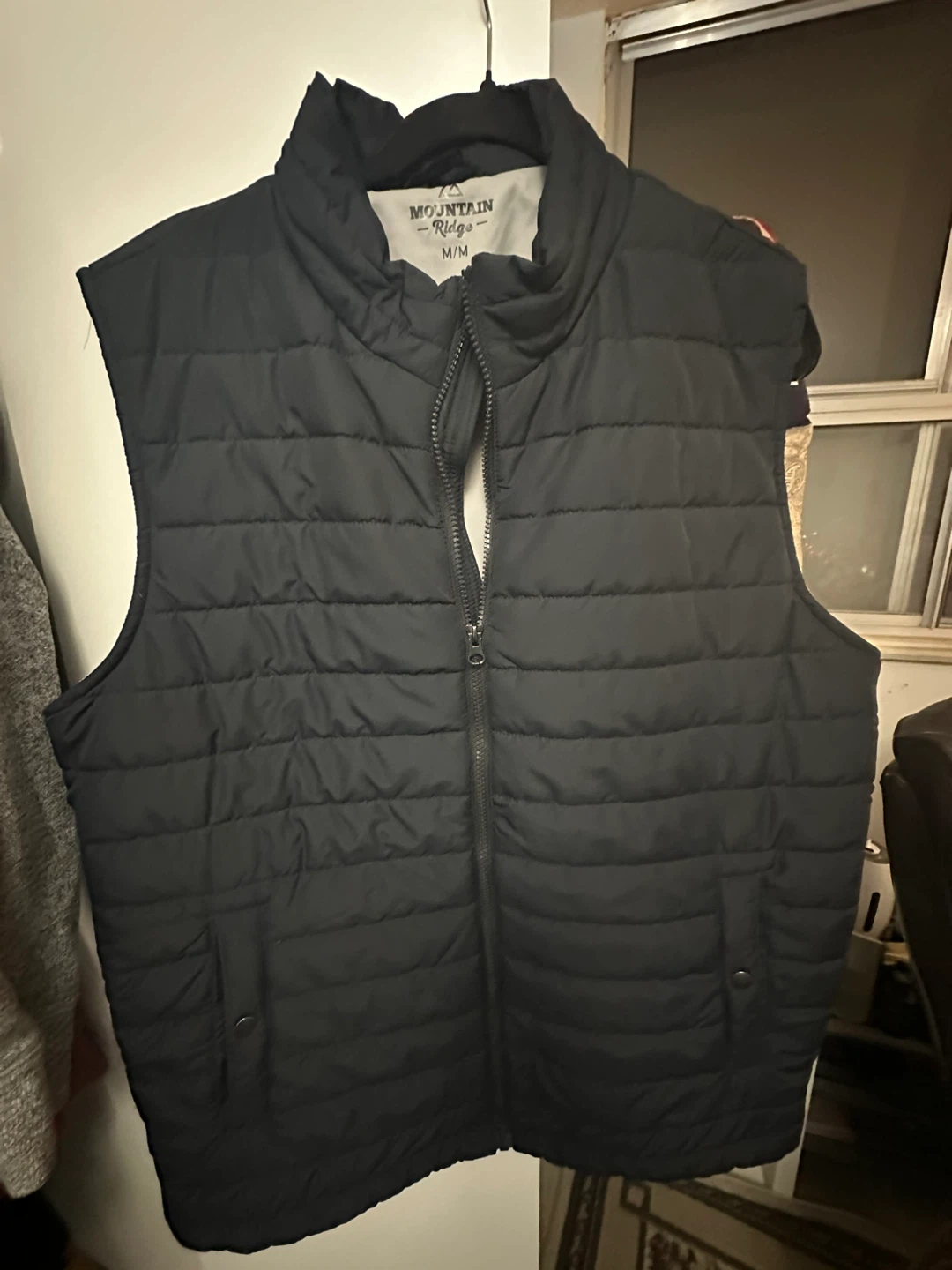 This is a black puffer vest from Mountain Ridge. It's a size M/M. It zips up the front and has two pockets.