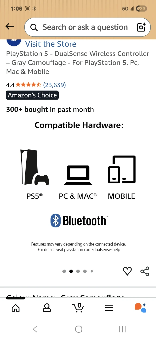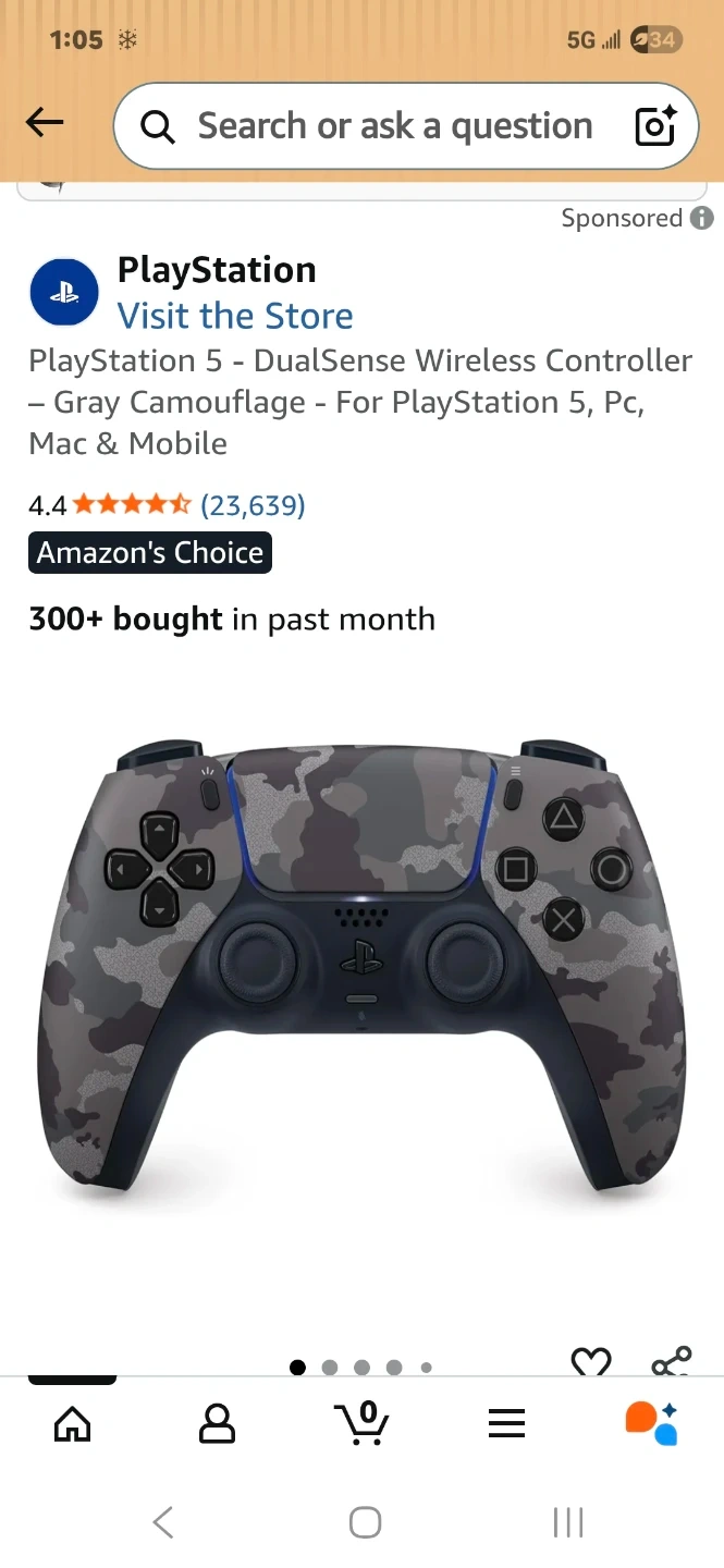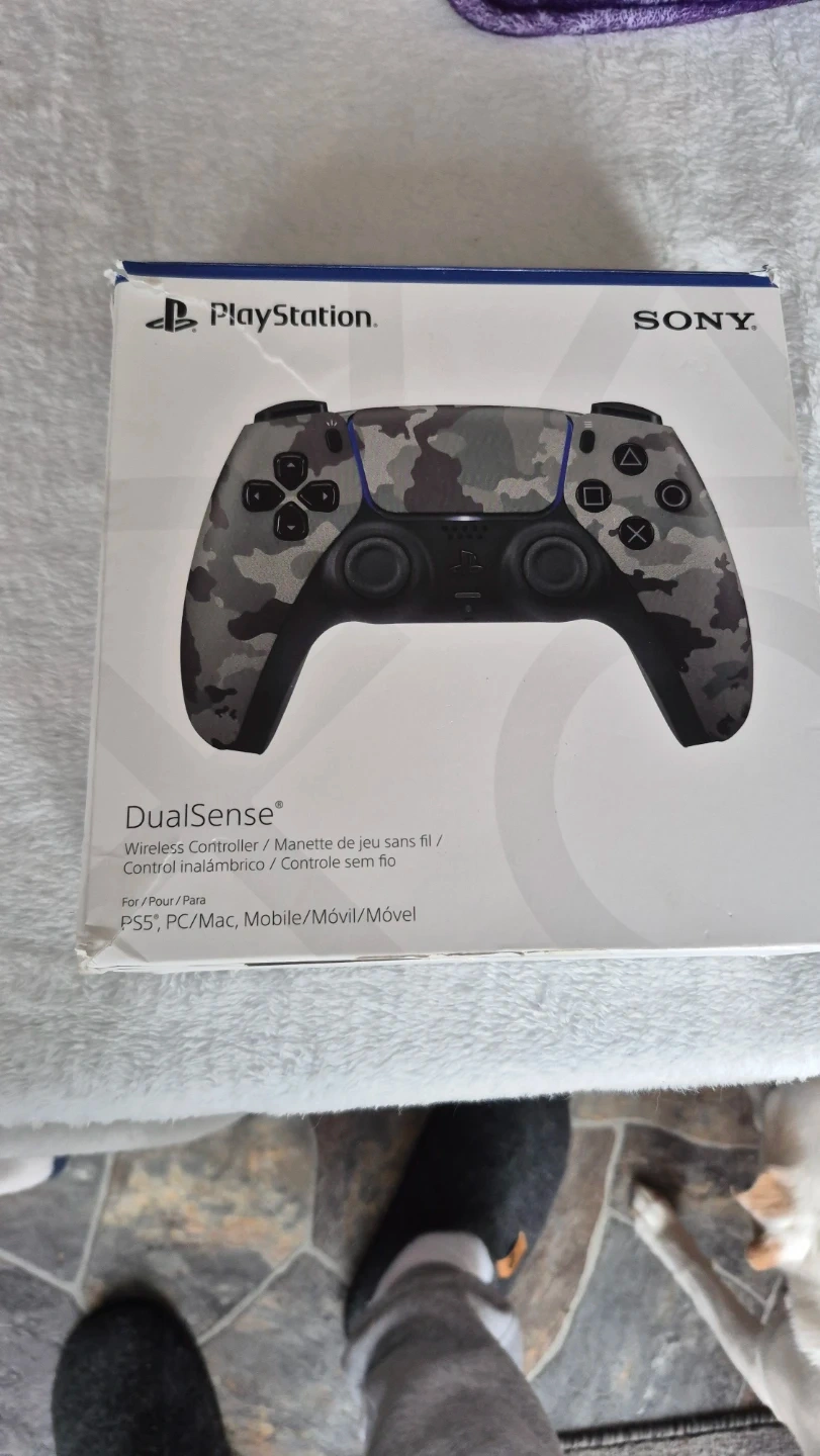 This is a PlayStation 5 DualSense wireless controller in a Gray Camouflage design. It's compatible with PS5, PC, Mac, and mobile devices via Bluetooth. Includes the original box.