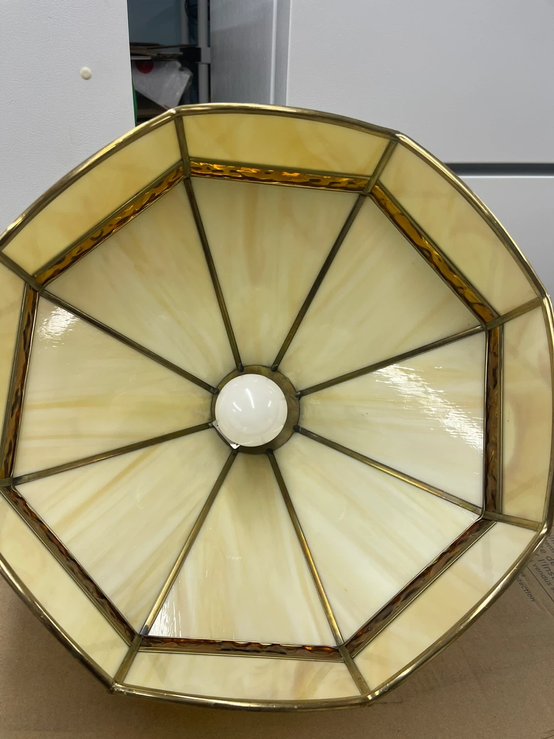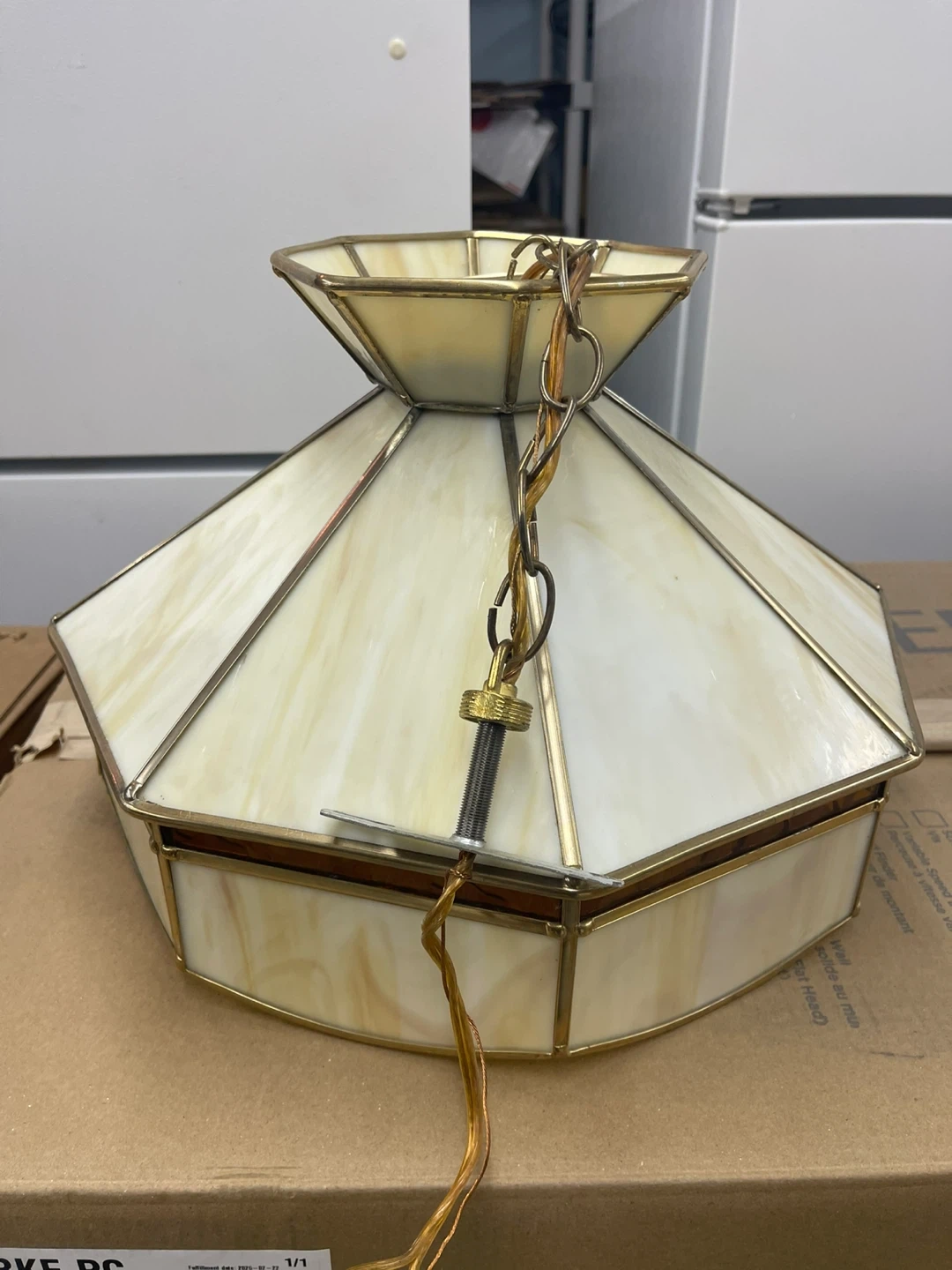 This is a Tiffany style stained glass pendant light fixture with a brass-coloured metal frame. From the 1970s style It features a cream and amber marbled glass shade. Includes a metal hanging chain and electrical cord. 15”D x 12” H. Cash only