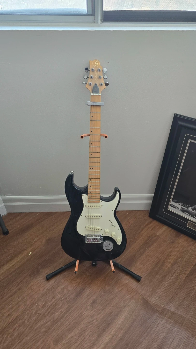 Black Squier Stratocaster electric guitar. Features a maple fretboard and white pickguard. Includes a capo. Ready for practice or performance!