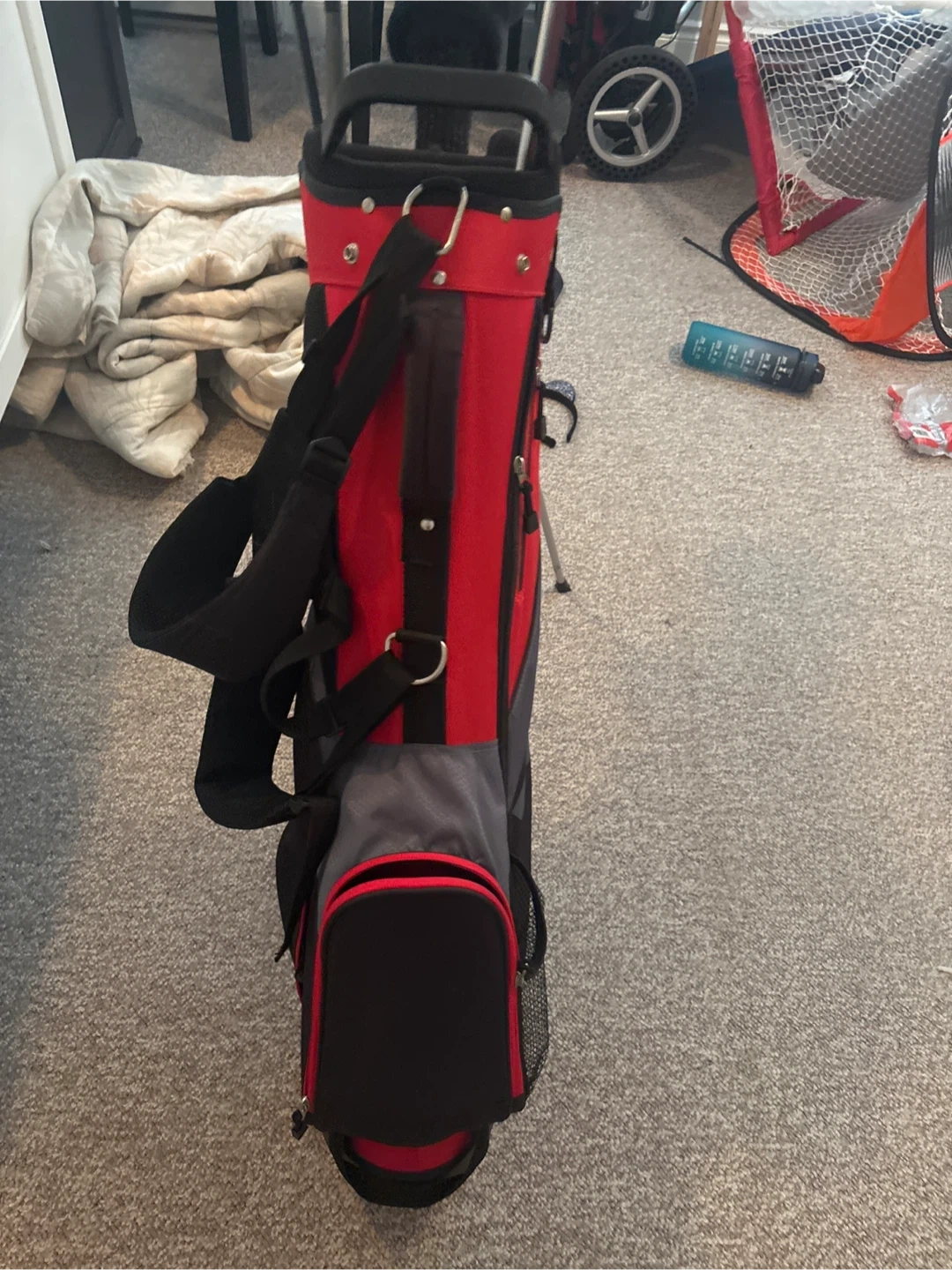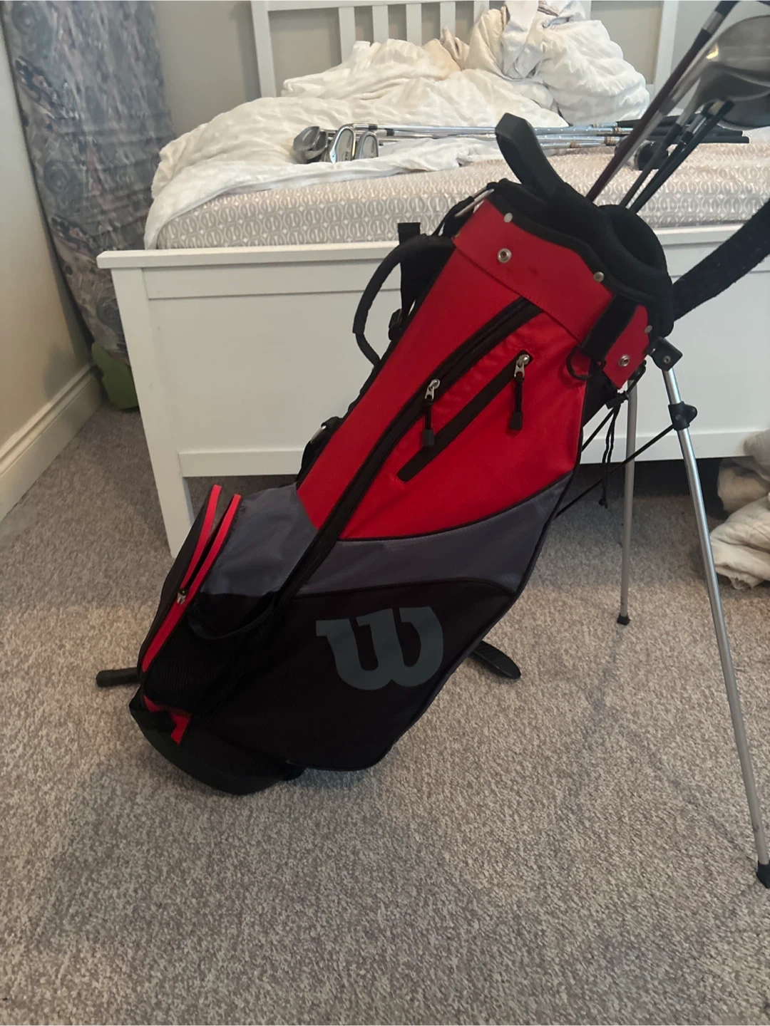 This red and grey Wilson stand bag comes with a set of assorted golf clubs. The bag features multiple pockets and a comfortable shoulder strap. It's ideal for the driving range or a quick nine holes!