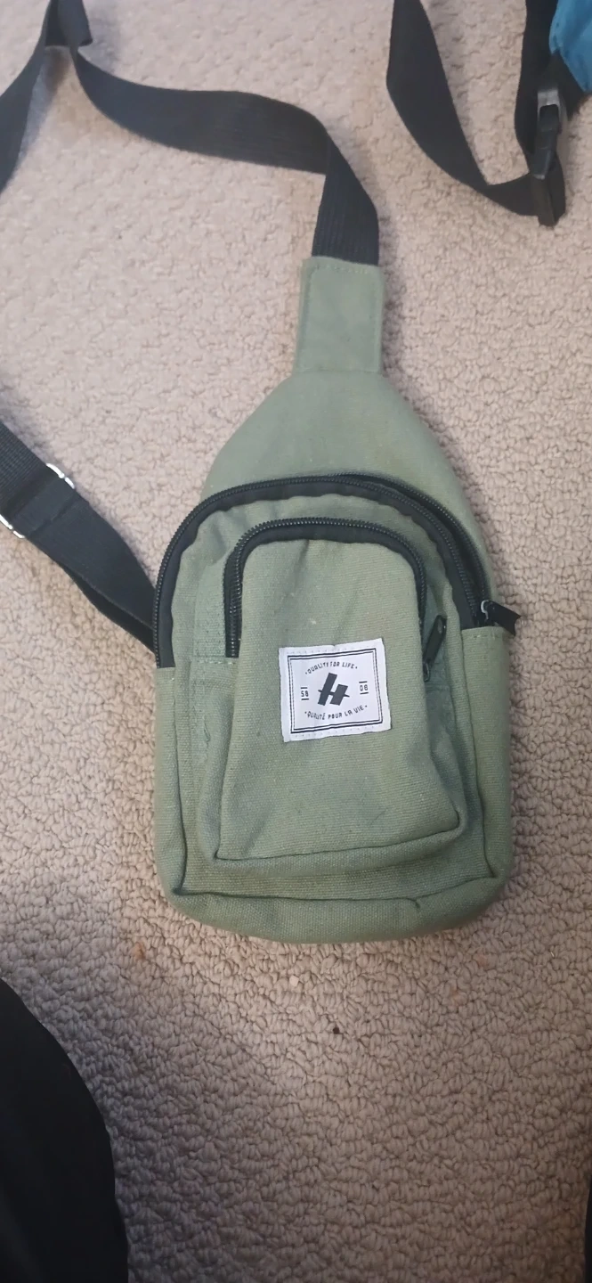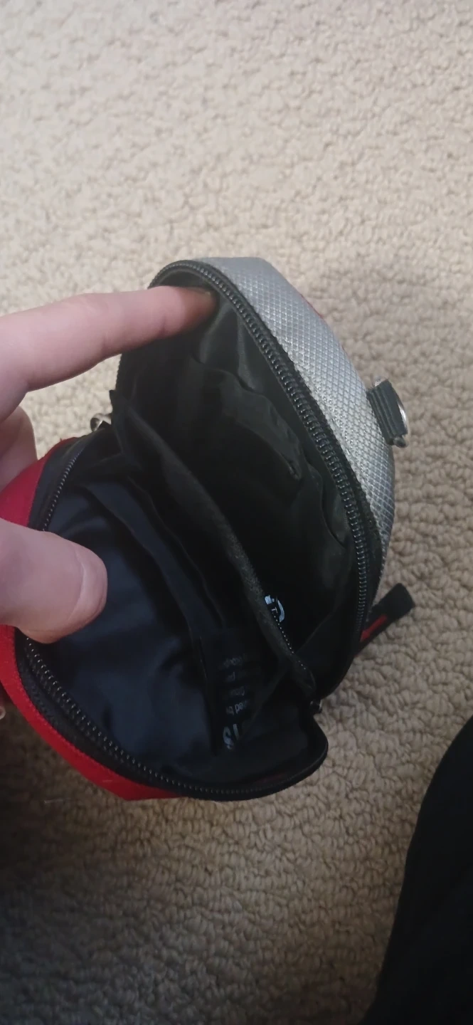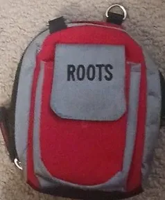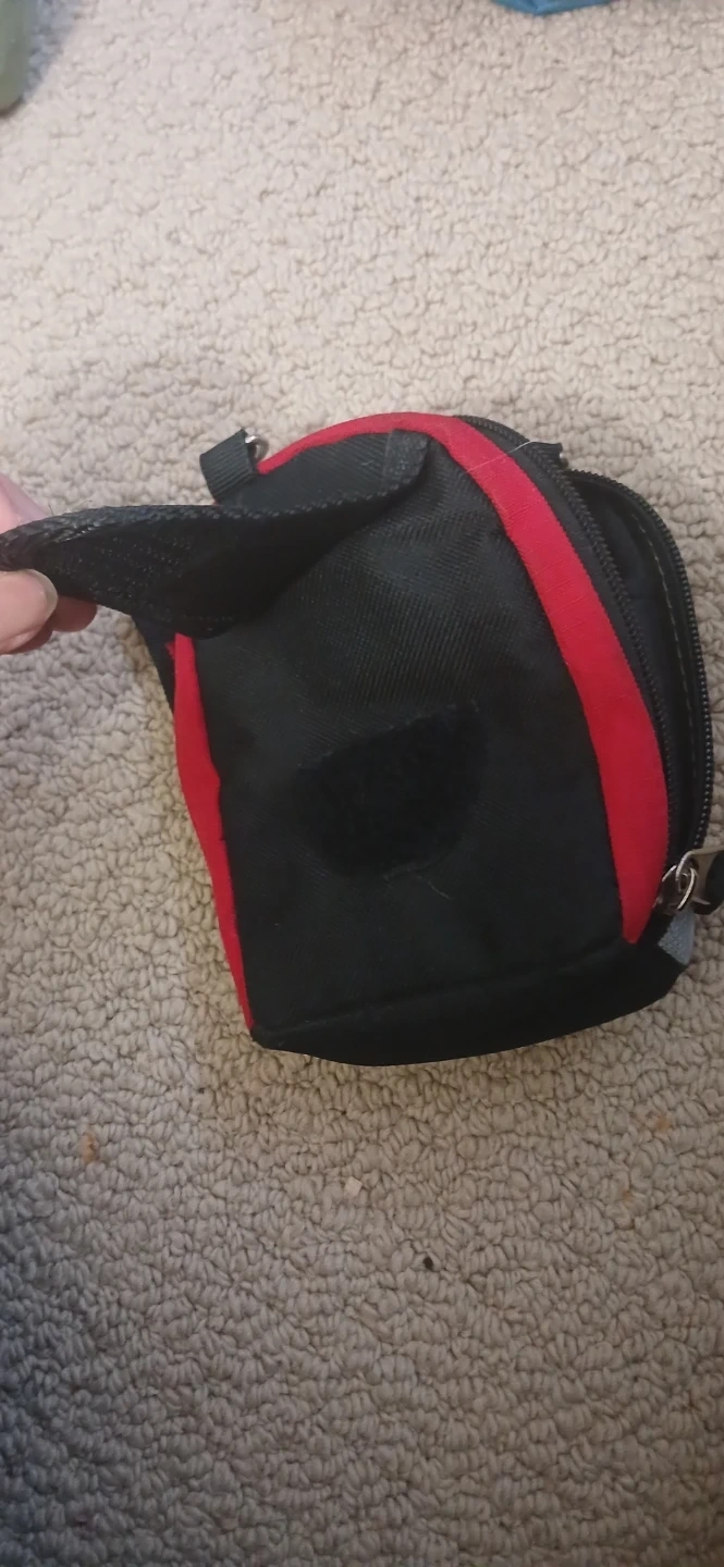 This is a small red and ue and green pouches . It has a zippered main compartment and a front pocket. Made with durable fabric.