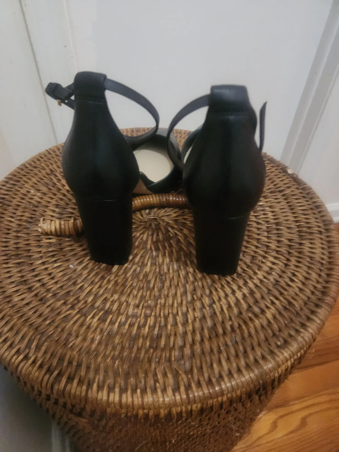 These ALDO heels are black with an ankle strap and block heel. They feature a pointed toe and cushioned insole. Leather upper. Heel height 3 inches.