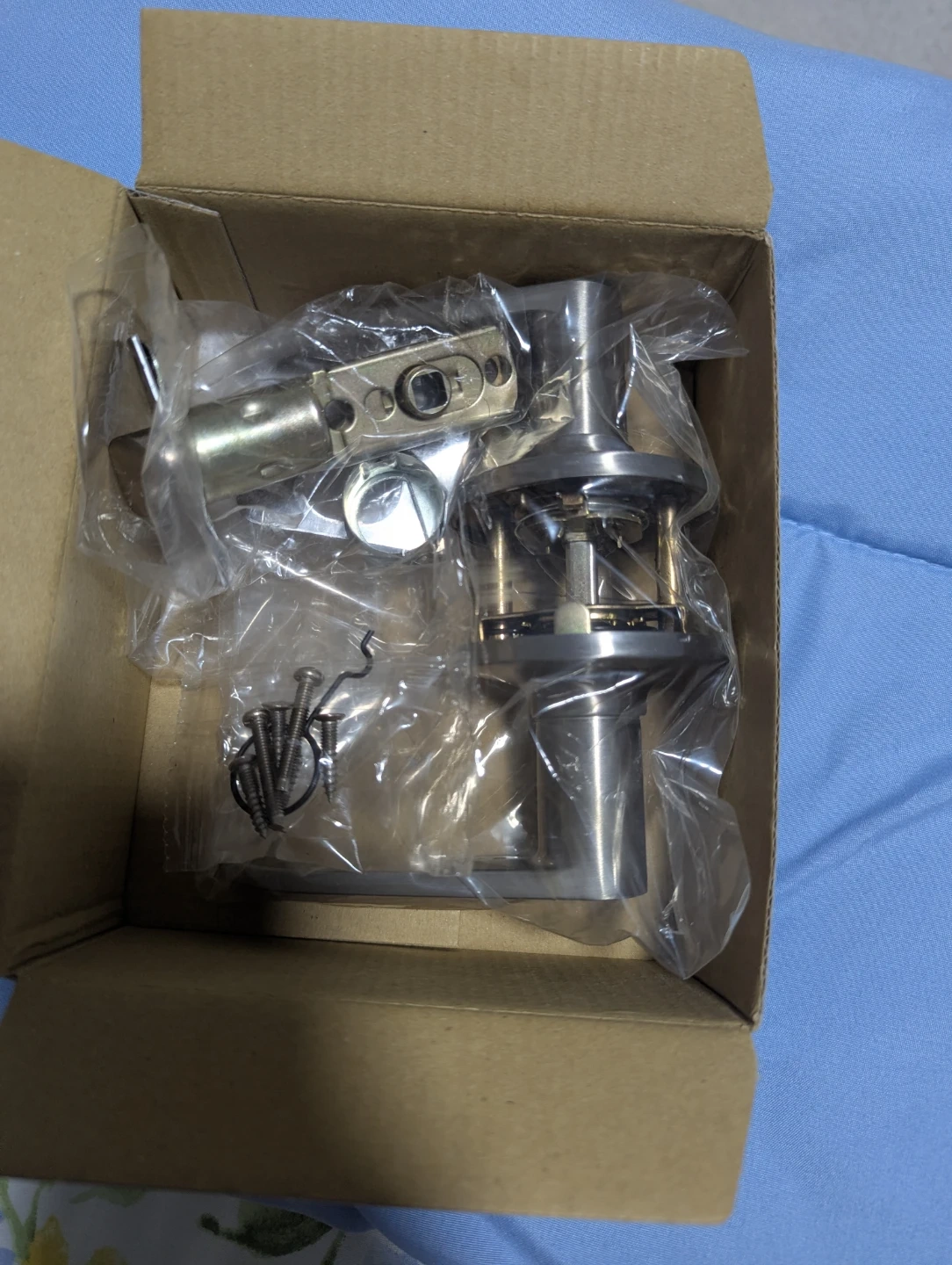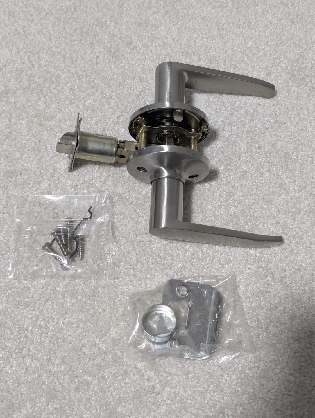 This is a brand new stainless steel lever door lock set. It includes the latch mechanism, strike plate, and all necessary mounting screws. A great replacement for any interior door!