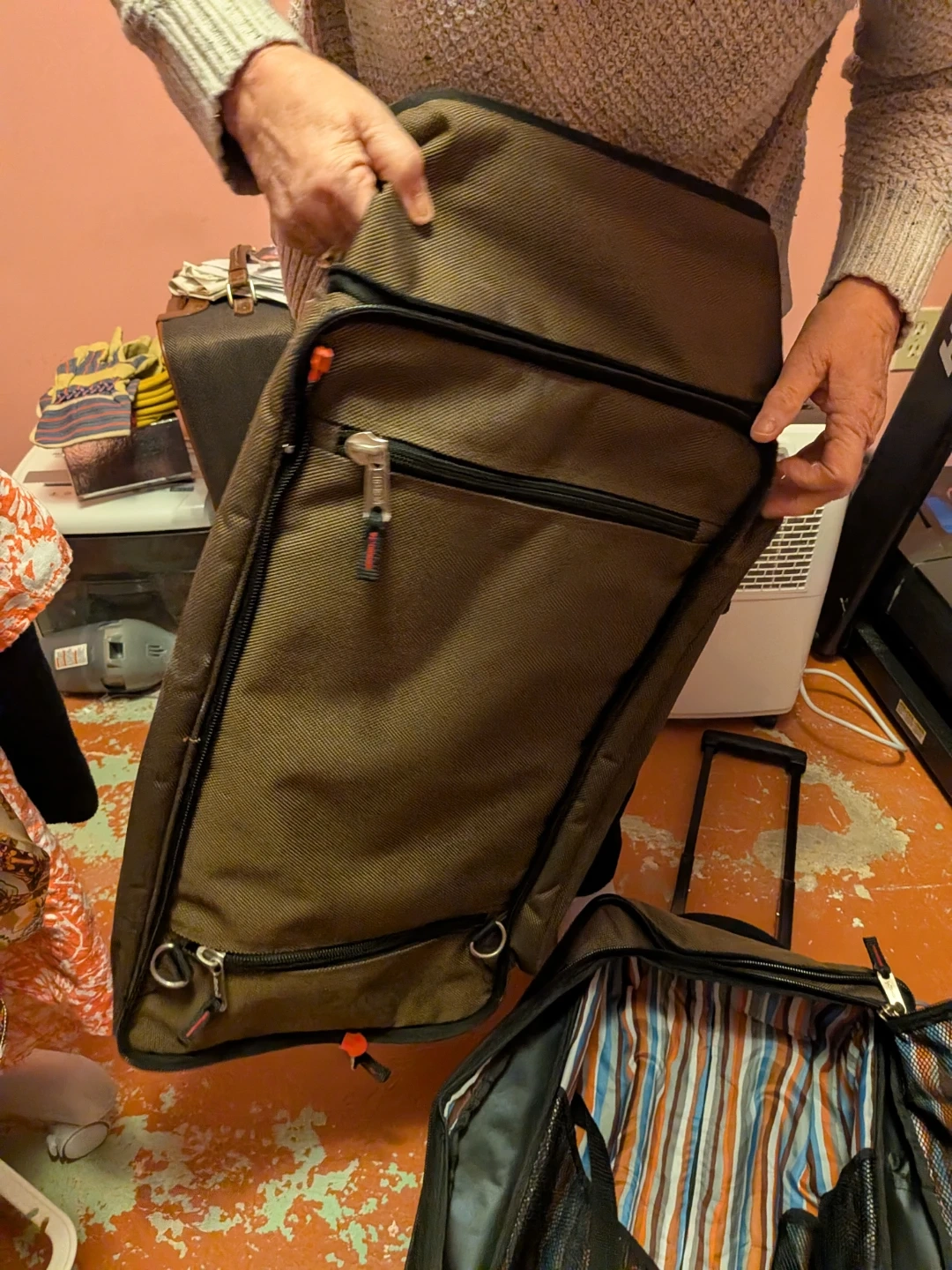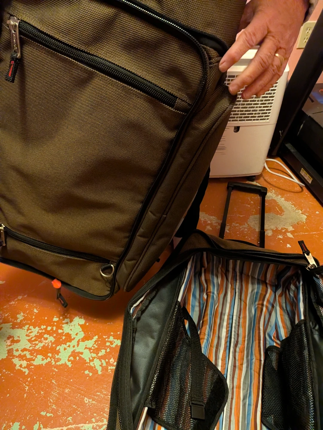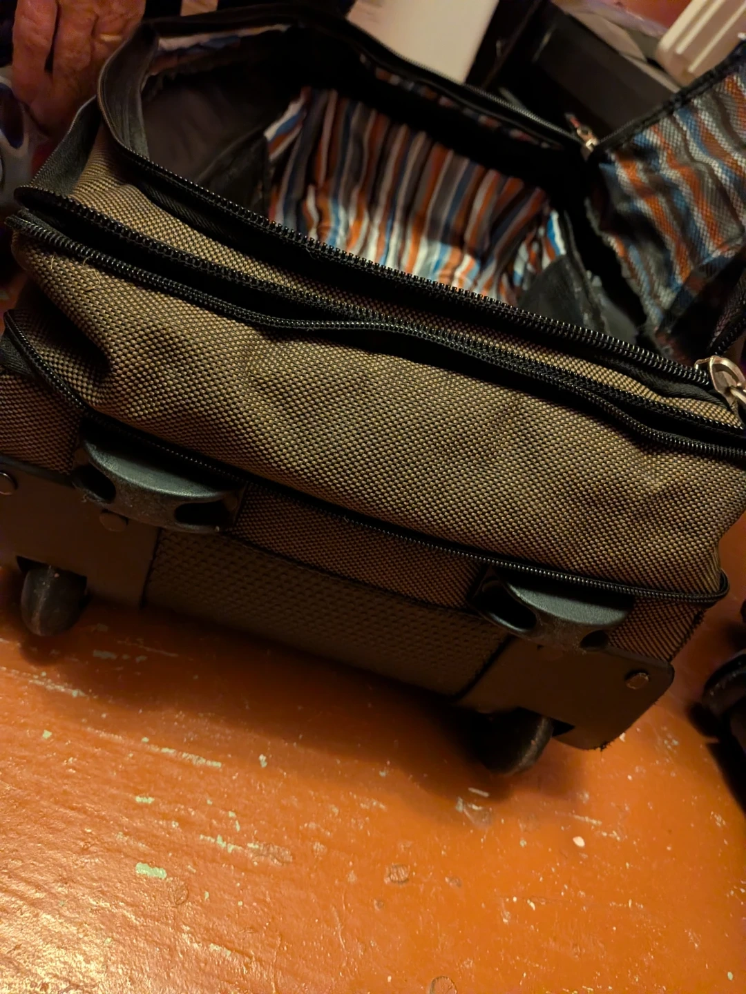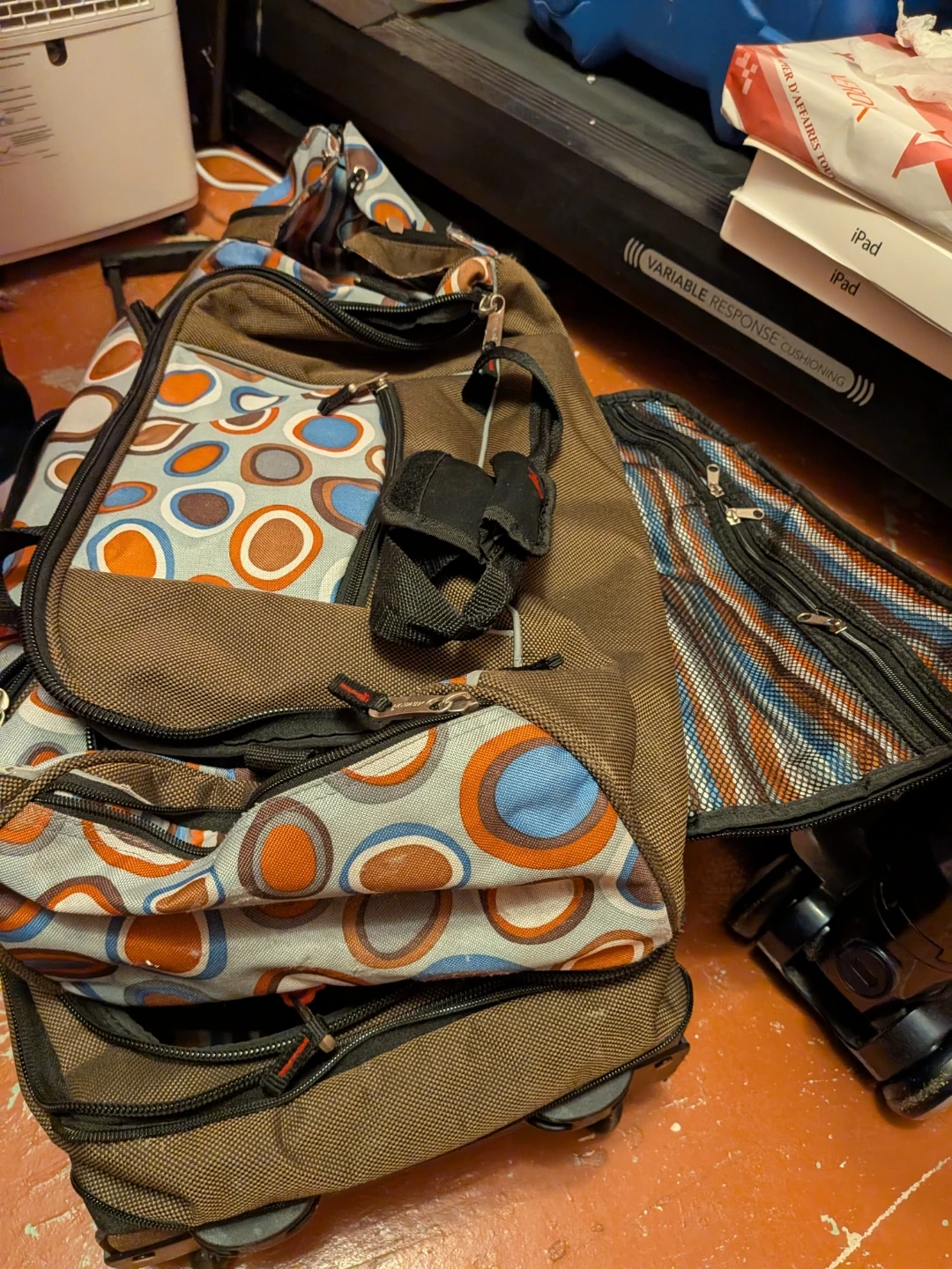 This is a brown rolling suitcase with a vibrant striped and circular pattern lining. It features multiple zippered compartments and a retractable handle. Its durable fabric construction makes it great for travel!