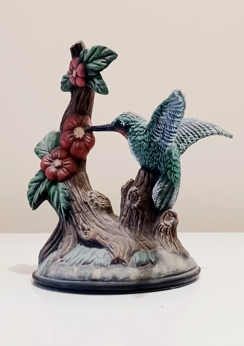 Add a touch of nature to your home with this unique, charming vintage , Hand Painted Hummingbird Figurine, featuring a detailed design of a hummingbird feeding from a flowering branch. The figurine is in excellent condition, displaying vibrant colours and intricate details.
