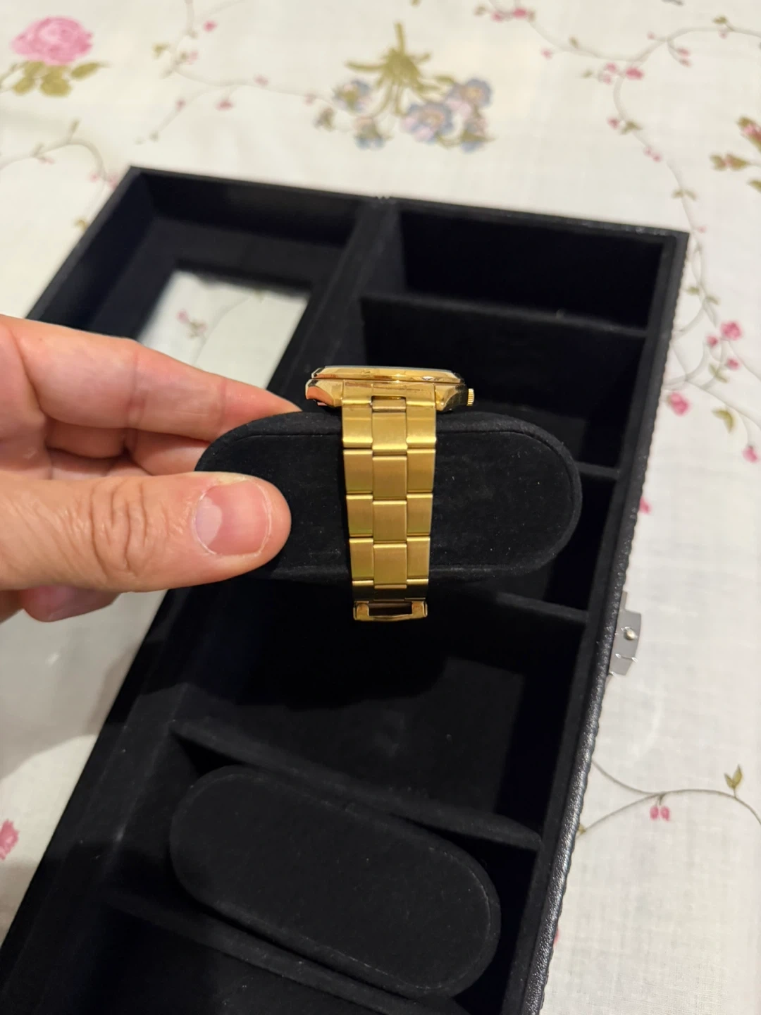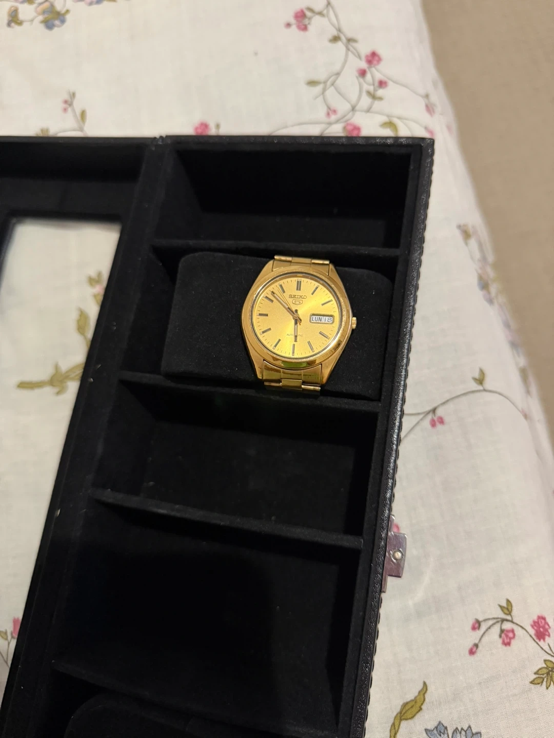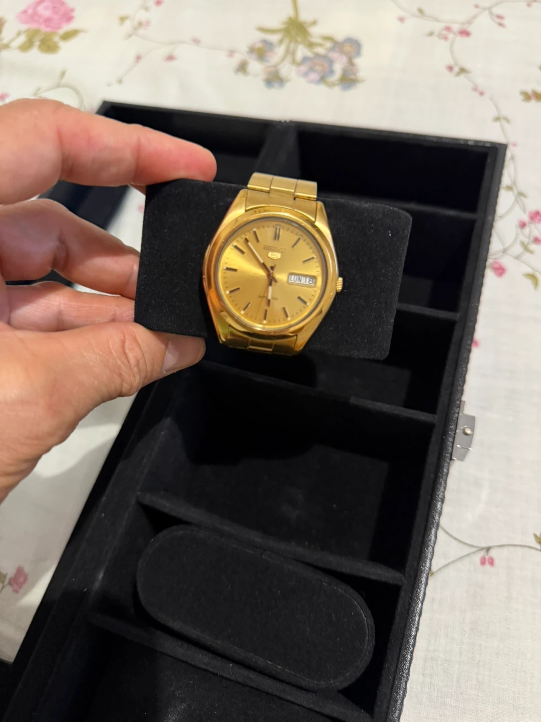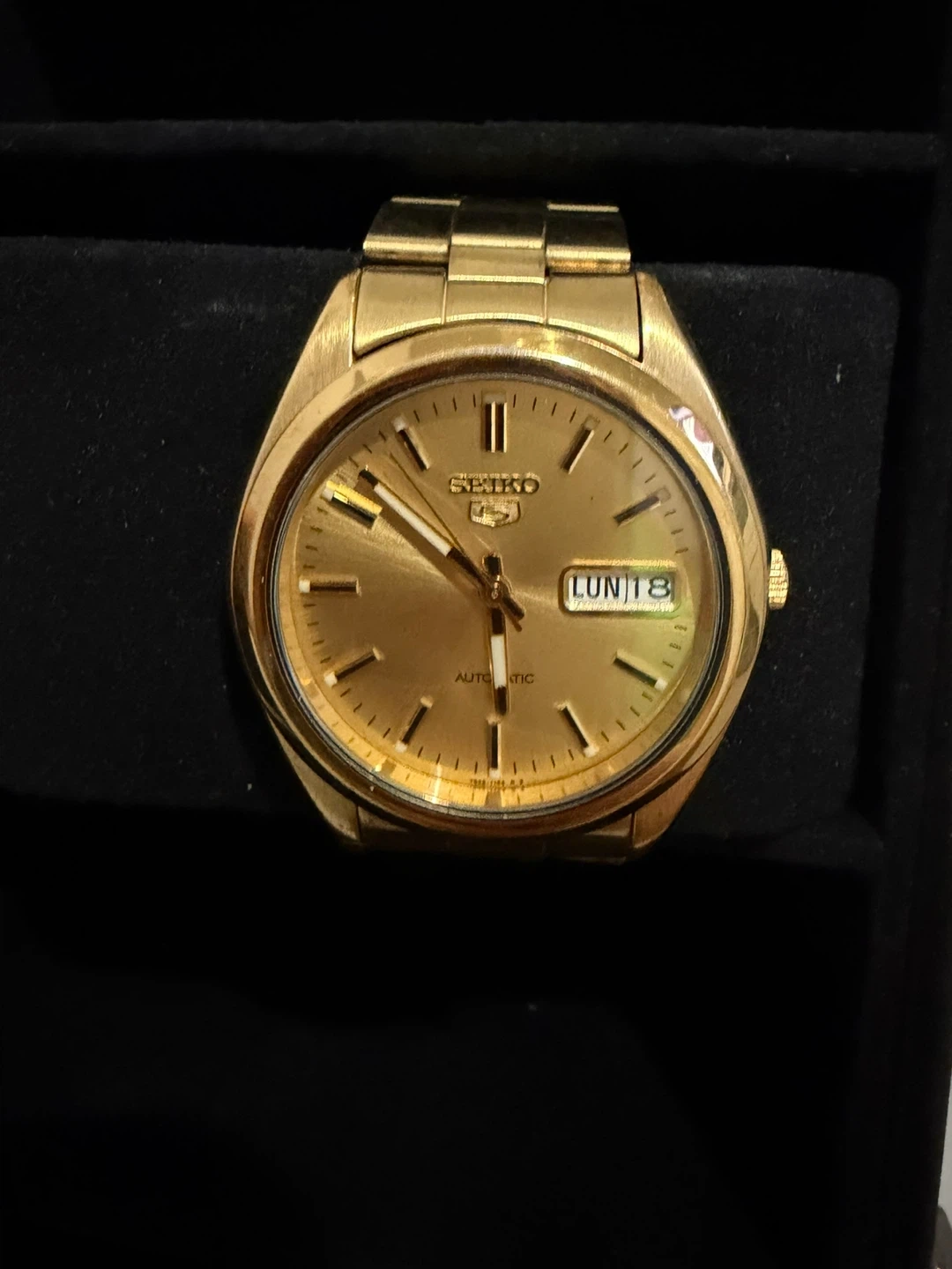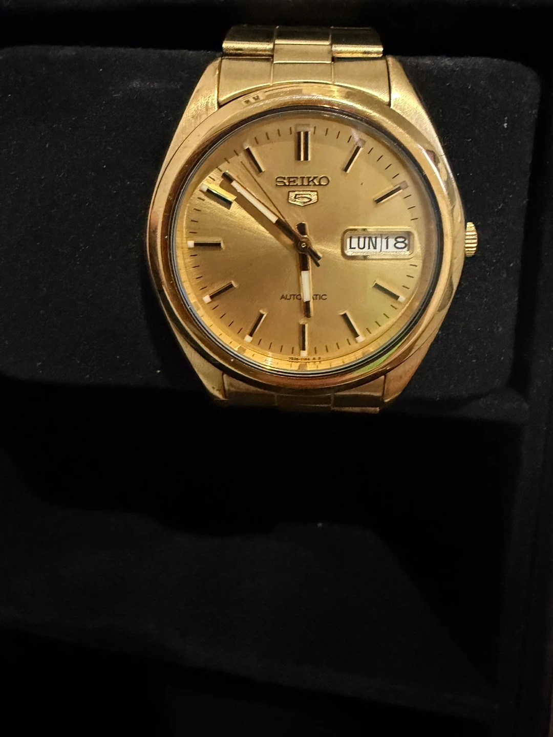 Buy & SellGold Seiko 5 Automatic WatchGold Seiko 5 Automatic Watch$200This is a Seiko 5 automatic watch with a gold-toned face and band. It features a day and date display. The watch is in good condition.BrandSeikoWHERE TO MEETCheck LocationView MapSELLERverifiedCarlosTrinity Bellwoods1116 reviews0 chats·2 favorites·43 viewsSEND CHAT TO SELLERHi Carlos! I’m interested in your listing.Hi Carlos! I’m interested in your listing.Get the Karrot app to chatSign In to chat